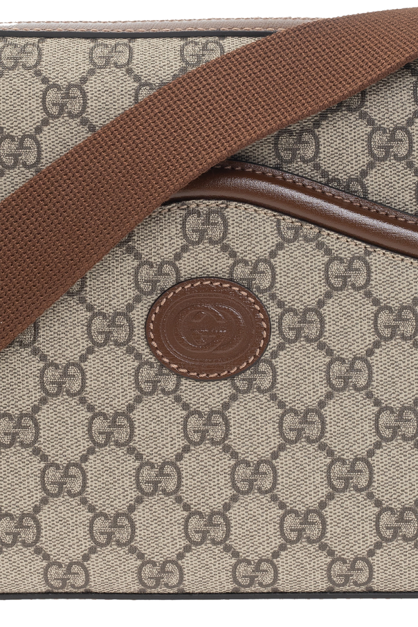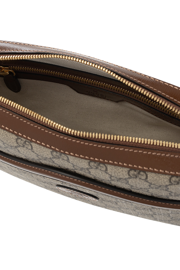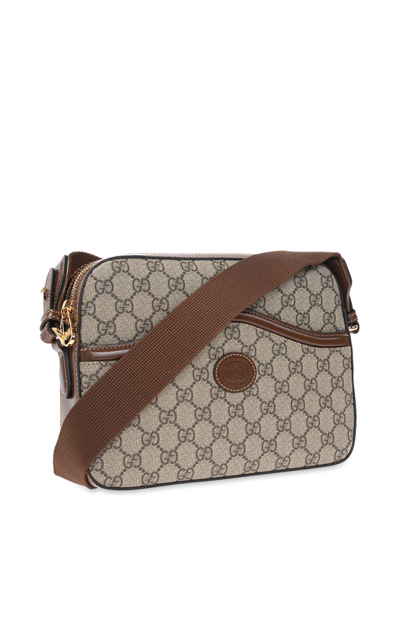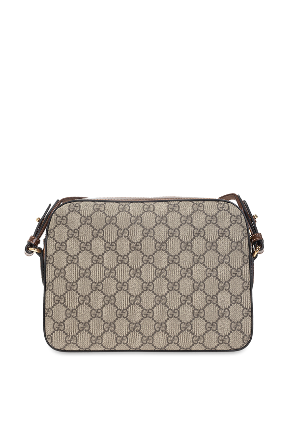 Brown and beige shoulder bag from Gucci. Made of patterned GG Supreme canvas with smooth leather trims, this model fastens with a zip and is complete with an adjustable strap in brown, front zip pocket with a logo, gold-tone metal hardware and one internal compartment with cream lining and one zip pocket.
