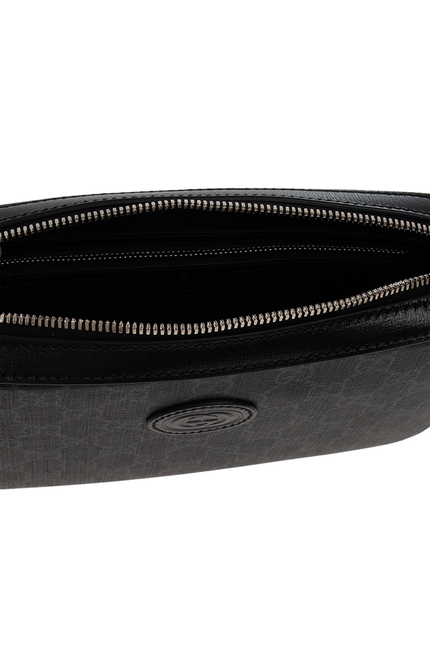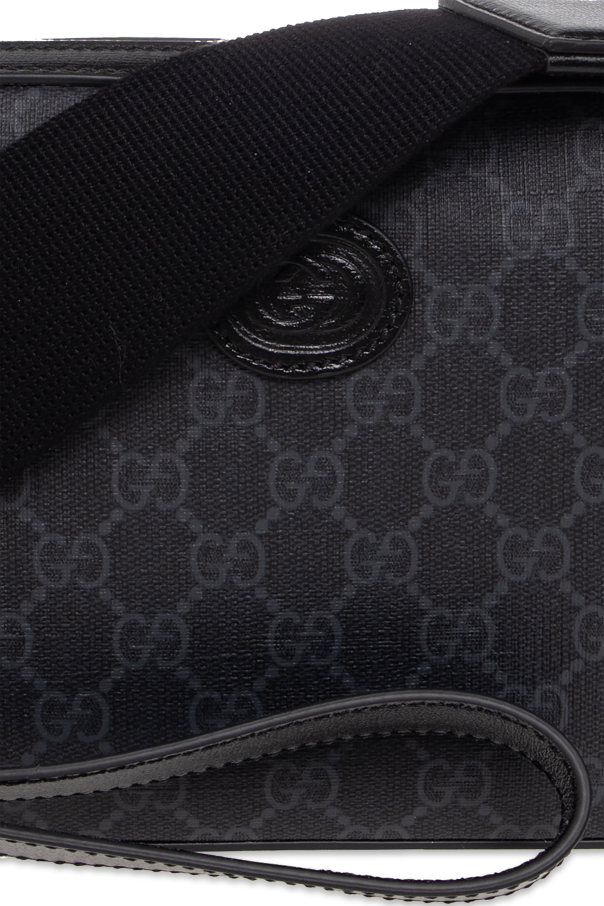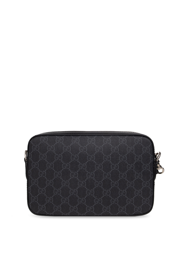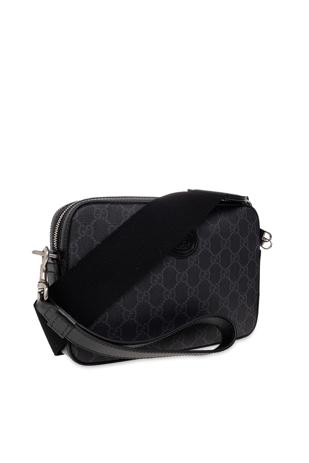 Black and grey shoulder bag from Gucci. Crafted from the brand's signature GG Supreme canvas and trimmed with leather, this design secures with a two-way zip and showcases a patch with an embossed Interlocking G logo, a detachable wrist strap, an adjustable shoulder strap, silver-tone metal elements and one internal compartment with a zip pocket.