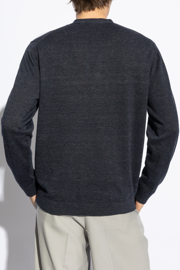 Introducing the epitome of sophistication and timeless style: the Navy Buttoned Cardigan by Theory. Crafted with meticulous attention to detail, this garment is a harmonious blend of luxurious materials, including linen, cotton, polyester, and other fine fabrics. The result is a piece that feels as exquisite as it looks. The cardigan's design is a masterpiece of understated elegance, featuring a classic, simple cut with long sleeves and a v-neckline that exudes a refined charm. Its fabric boasts a fine, regular knit texture that underscores the premium quality of the craftsmanship. The deep navy hue, enriched with a subtle melange, adds depth and texture, enhancing the garment's overall allure. Seamless in its execution, the cardigan is adorned with medium-sized buttons closely matching the fabric's color, ensuring a cohesive and polished appearance. The absence of external branding or embellishments speaks volumes of the designer's commitment to subtlety and discretion, allowing the quality and design to shine on their own merits. Exhibited on a model, the cardigan reveals a relaxed fit that promises comfort and ease of movement, making it an ideal choice for those who value both style and practicality. Its smooth back and minimalist aesthetic affirm its place as a timeless piece that transcends seasonal trends. Why Purchase This Product? Elegant design that combines simplicity with sophistication. Made from a blend of high-quality materials for ultimate comfort and durability. Versatile navy color with subtle melange, perfect for various occasions. Designed by Theory, a name synonymous with modern elegance and refined wardrobe essentials.