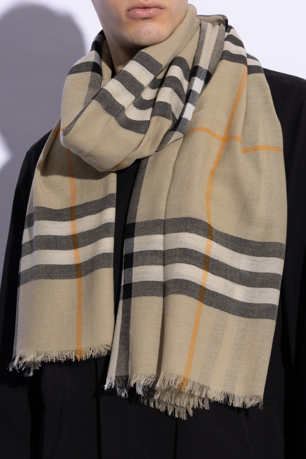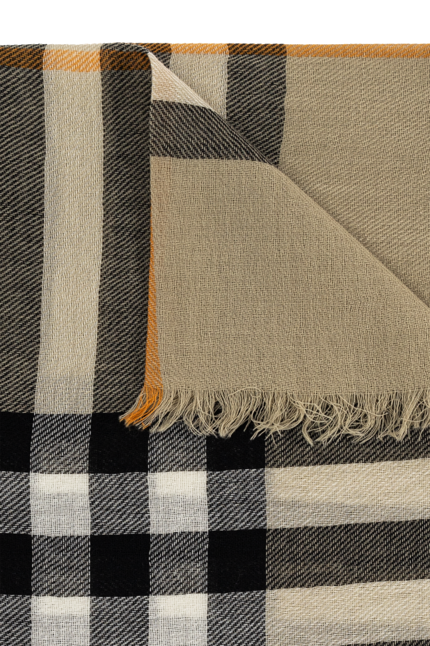 Introducing the quintessence of sophisticated warmth and timeless design, our Plaid Wool Scarf by Burberry is a testament to refined craftsmanship. Crafted from 100% high-quality wool, this piece not only promises exquisite softness but also enduring warmth, making it a perfect companion for the cooler seasons. The scarf showcases a classic plaid pattern, where broad stripes of black intersect with beige fields, and hints of dark orange lend contrast and vivacity to the ensemble. The edges of the scarf are meticulously finished with fringes, a detail that adds an additional layer of elegance and character to this accessory. The fabric's texture, visible in detailed photographs, suggests a garment of exceptional caliber, typical of the luxurious offerings from Burberry. Whether folded neatly or draped over the shoulders, the scarf maintains its distinguished appearance, seamlessly integrating with both casual and formal attire. Why Purchase This Product? Exemplary quality material, ensuring both comfort and durability. Timeless design, featuring a versatile plaid pattern with a sophisticated color palette. Elegant fringe detailing, adding a touch of refinement. Versatile wearability, enhancing both casual and formal looks with ease.