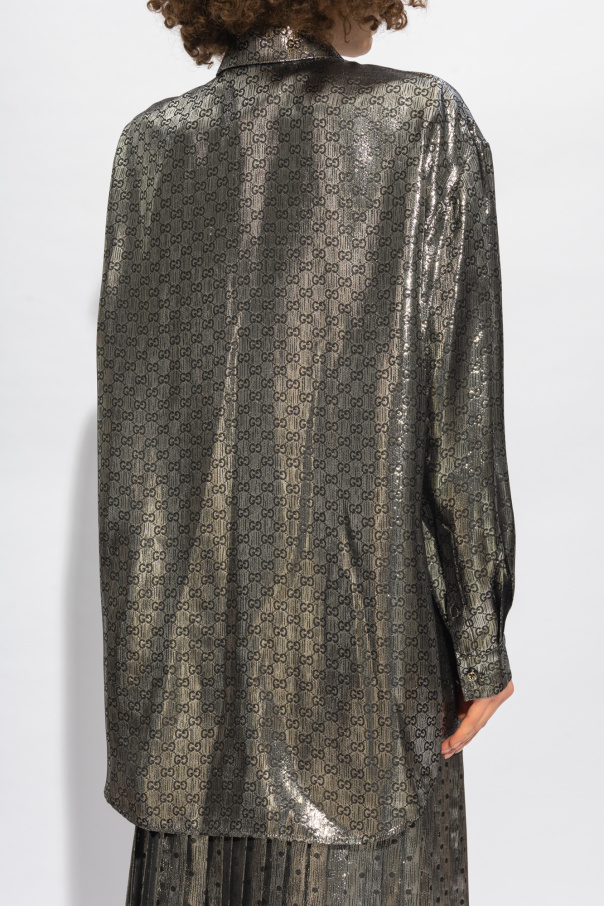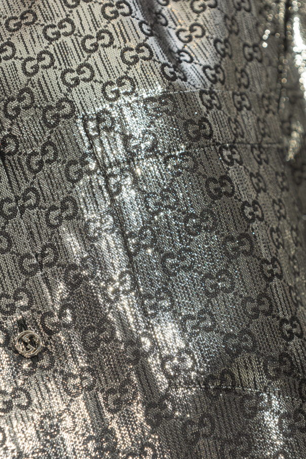 Silver-tone shirt from Gucci. Made from a metallic material, this style fastens via buttons and showcases a monogram pattern, one slip chest pocket, long sleeves with button cuffs and a collared neckline.