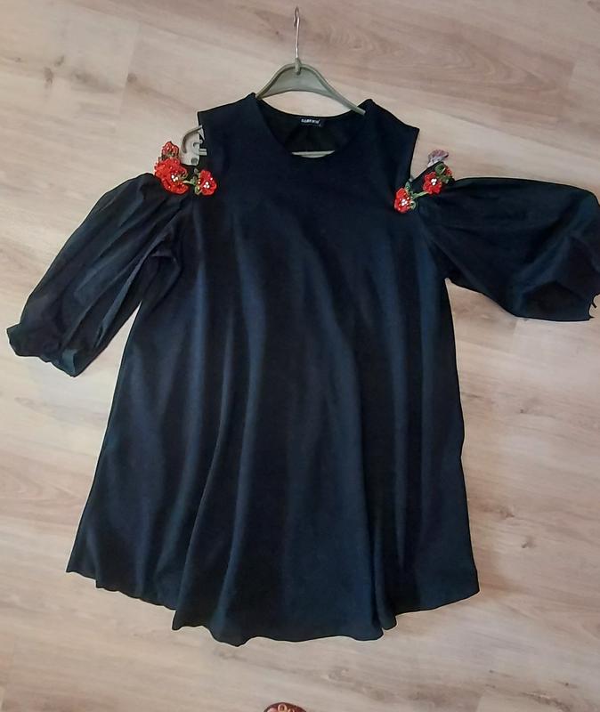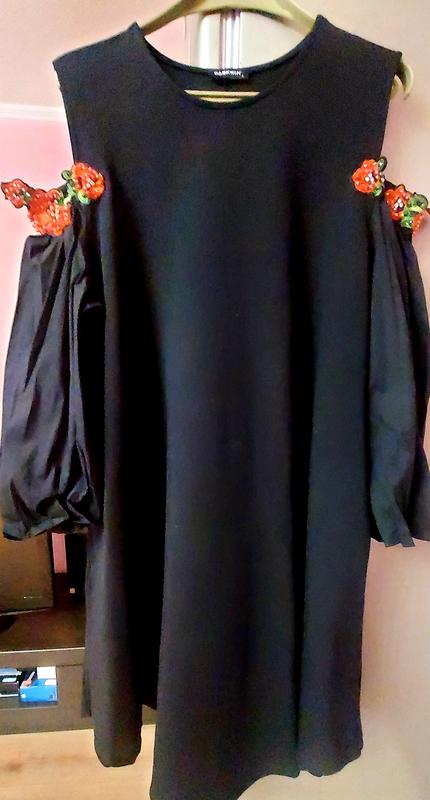 очень нарядная платье - туника из плотного трикотажа , а- силуэт, скрывает все недостатки фигуры , плечи открыты, украшены аппликацией из качественных камней, шикарные шёлковые рукава, низ закруглен, р 62-68, ткань со стрейчем,турецкая фабрика супер батальных размеров , плечи-40,пог-64, поб-77 пог-64,длина -87-96, состояние идеальное, пр Во Турция