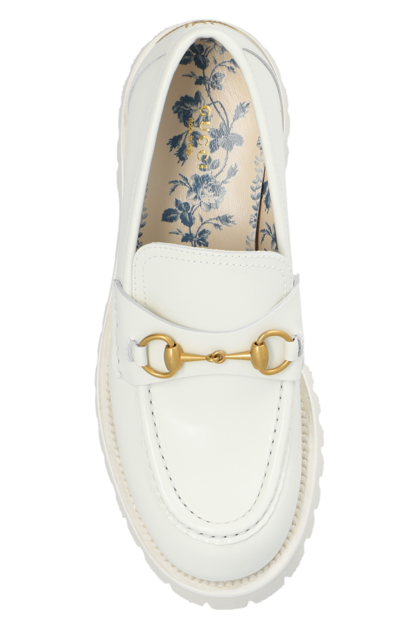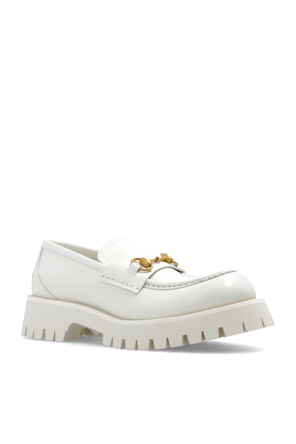 White loafers from Gucci. Made of leather with a slip-on silhouette, this model sits on a white lug rubber sole and showcases the brand's signature horsebit hardware and gold-tone logo embroidery.