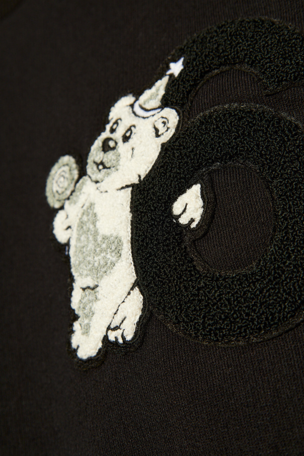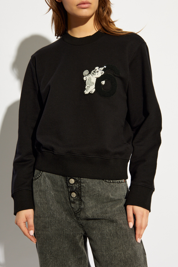 Introducing the MM6 Maison Margiela Zip-Up Hoodie, a paragon of classic style fused with avant-garde detailing. Dominated by an elegant black hue, this hoodie boasts a traditional silhouette with a round neckline and long sleeves, each meticulously finished with a snug ribbed cuff. The bottom hem mirrors this snug fit, ensuring a polished look. What sets this piece apart is the distinctive patch on the front, featuring a whimsical, animated character holding a lollipop, set against the backdrop of the letter 'G'. This patch, rendered in a contrasting white against the black, has a unique three-dimensional appearance, giving it a tactile feel. The 'G' is crafted from a black, fur-textured material, adding an element of depth and intrigue. The garment's back is sleek and unadorned, emphasizing the smooth, cotton or cotton blend fabric that promises both comfort and durability. This hoodie is a testament to MM6 Maison Margiela's dedication to high-quality materials and exquisite craftsmanship, making it a must-have for those who appreciate the finer things in life. Why purchase this product? Exclusive design with a unique, three-dimensional patch that adds an artistic touch. Made from premium cotton or cotton blend, offering unparalleled comfort and softness. Classic styling with ribbed details for a refined, timeless look. Elegantly crafted by MM6 Maison Margiela, a brand renowned for its innovation and quality.