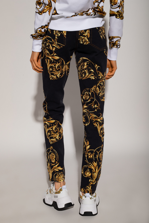 Black jeans from Versace Jeans Couture. Embellished with the brand's signature Barocco print in yellow, orange and brown, this pair features a zip fly with a button, classic five pockets, a logo patch, decorative buckle straps and slightly tapered legs.