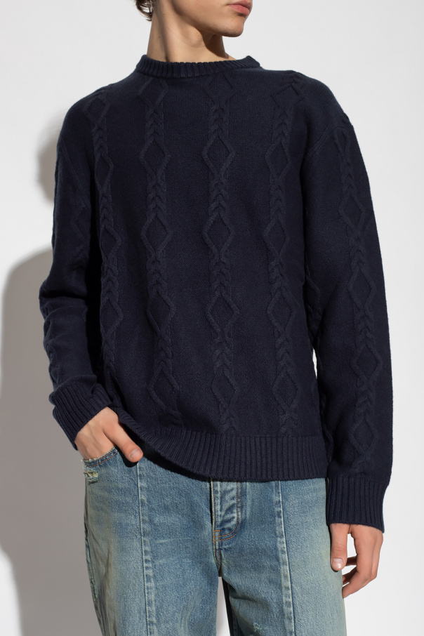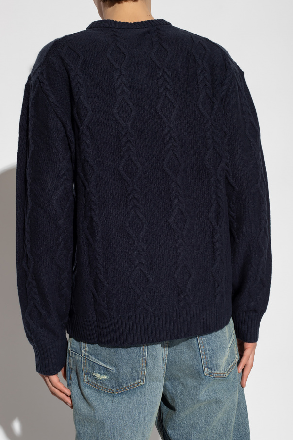 Navy ‘Mas’ sweater from Samsoe Samsoe. Crafted from a blend of RWS-certificated wool and recycled cotton, this design is enriched by an embroidered pattern and ribbed edges.