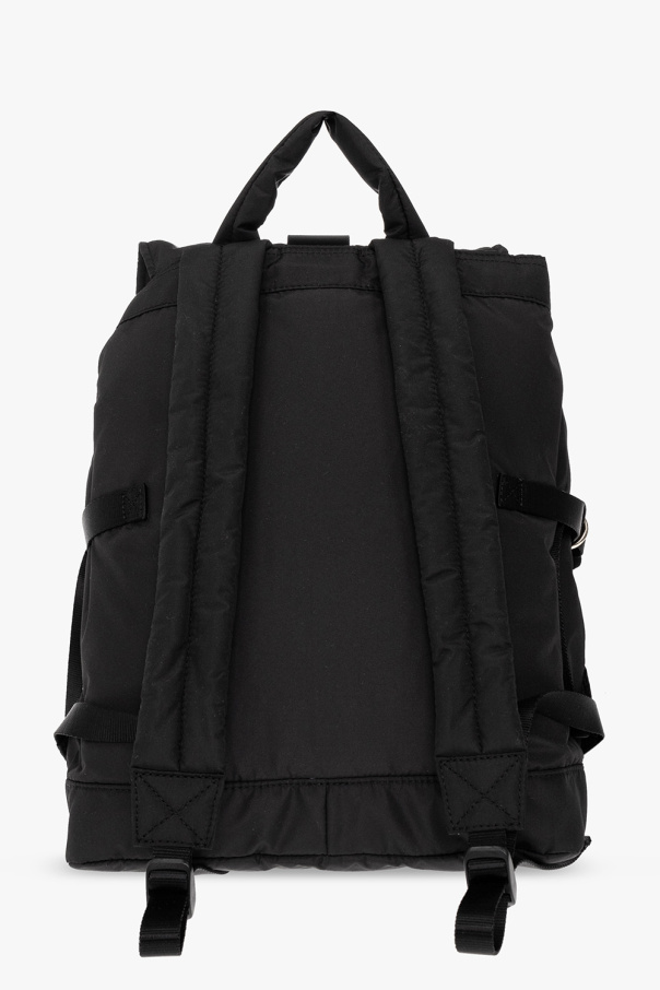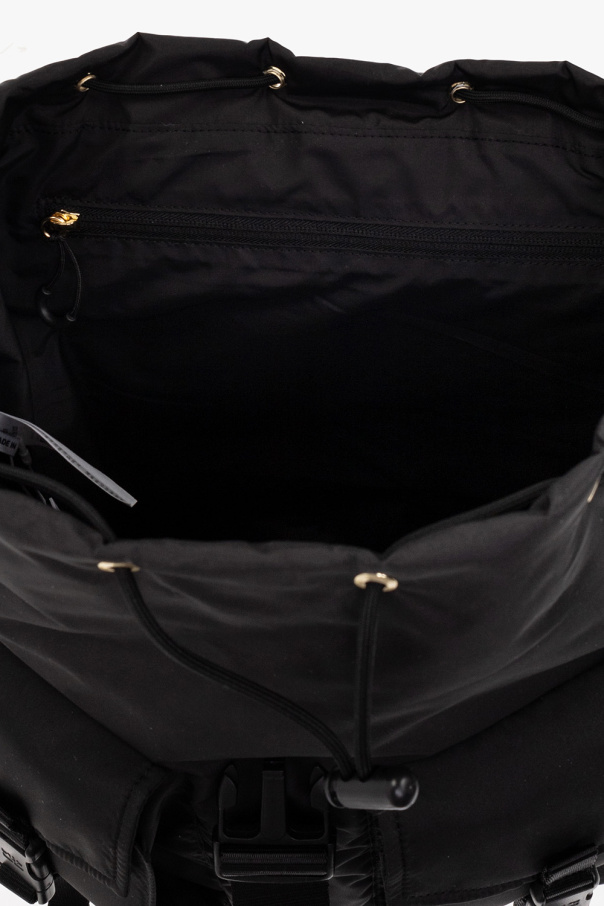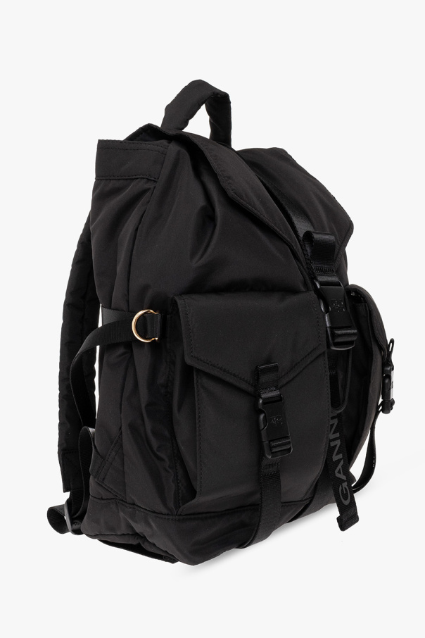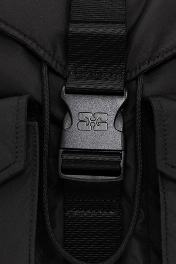 Black backpack from Ganni. Made of recycled fabric, this model fastens with drawstrings and snaps, and is decorated with a logo patch and print. It is complete with two snap-fastened front pockets, half-round handle, adjustable shoulder straps and one internal compartment with one zip pocket.
