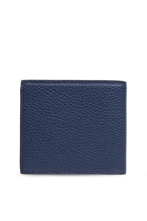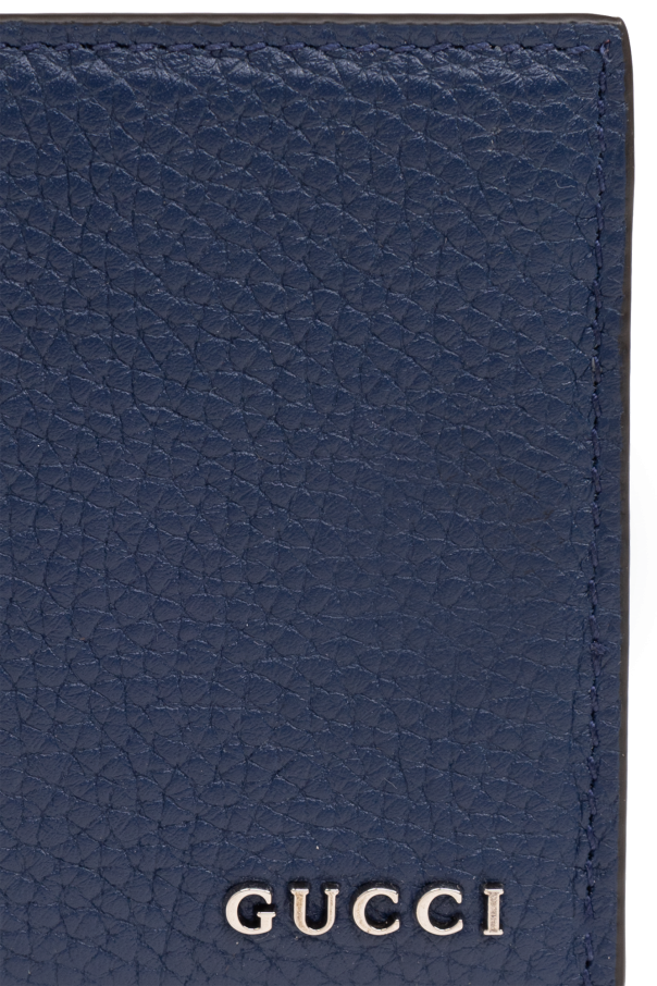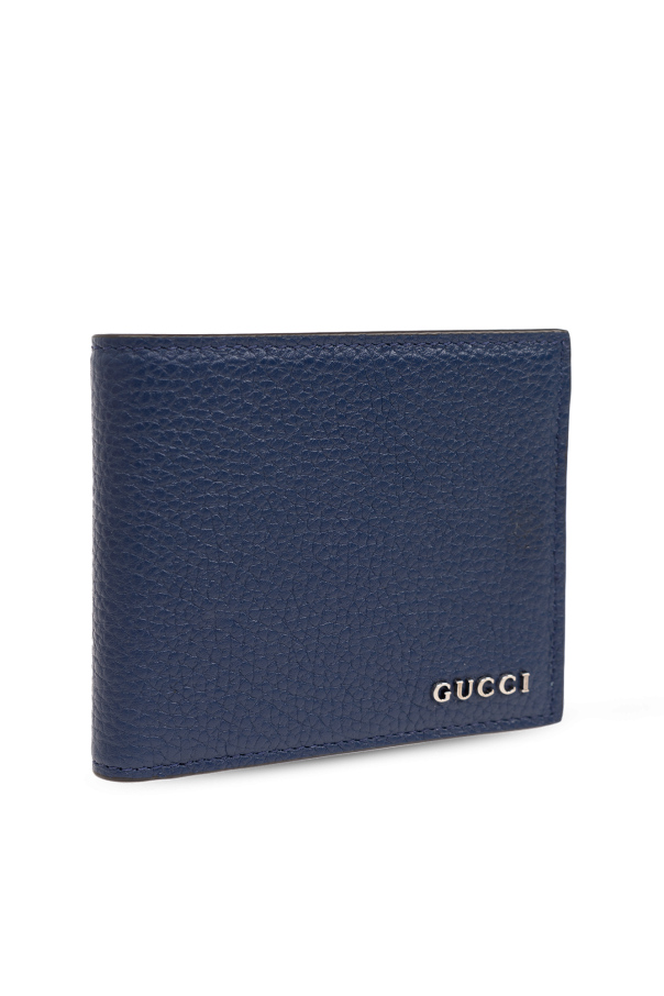 Navy bifold wallet from Gucci. Made from grained calf leather, this model is decorated with a metal logo detail and features two bill compartments, one snap-fastened coin pocket, two slip pockets and eight card slots inside.