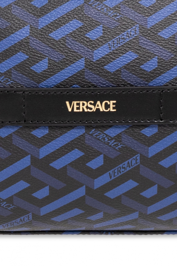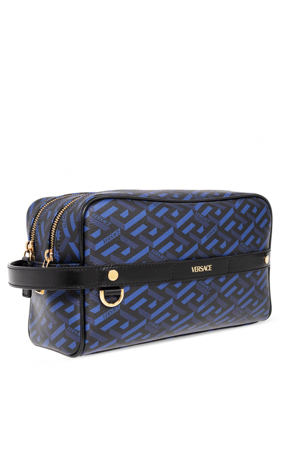Black, blue and navy blue wash bag from Versace. Crafted from canvas decorated with the brand's signature ‘La Greca’ pattern, this design features calf leather trims, two separate zip compartments, a logo print on the front, a half-round handle on the side, gold-tone metal hardware and two slip pockets inside.