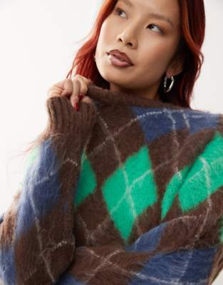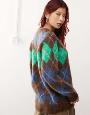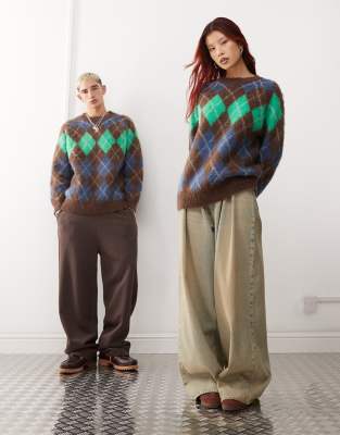 COLLUSION unisex oversized argyle fluffy jumper in brown