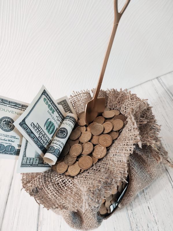 Материалы: Гипс, силиконовый наполнитель, гипоаллергенный клей, натуральная мешковина, веревка, монеты Украины, сувенирные доллары, молния, декоративная лопатка с золотым напылением.
