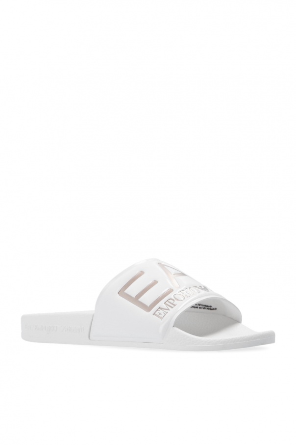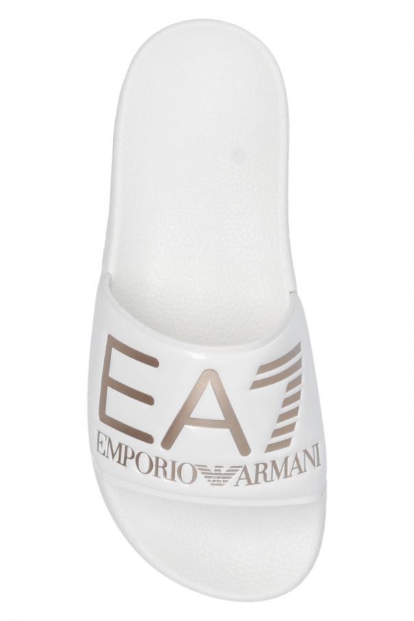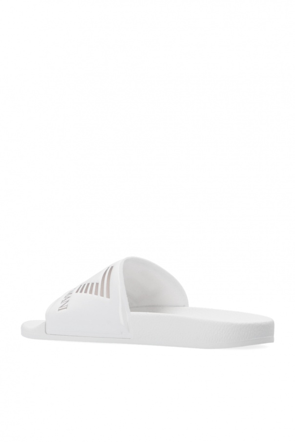 White slides from Emporio Armani. Embossed with the brand's logo in gold-tone, this rubber-crafted pair sits on a white sole.