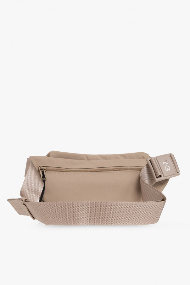 Beige belt bag from Y-3 Yohji Yamamoto. Emblazoned with a logo patch, this design features a zip fastening, a back zip pocket, an adjustable strap, black metal hardware and one internal compartment with one slip pocket and one zip pocket.