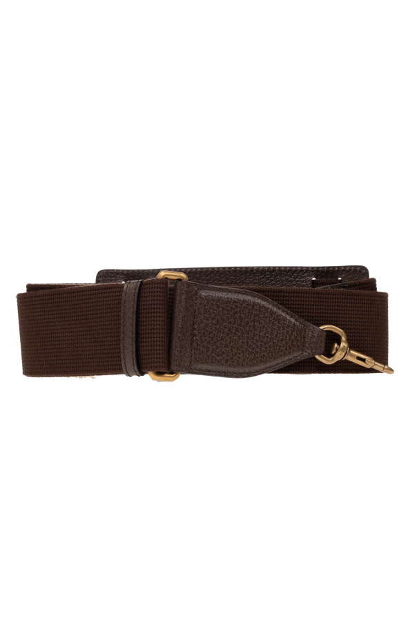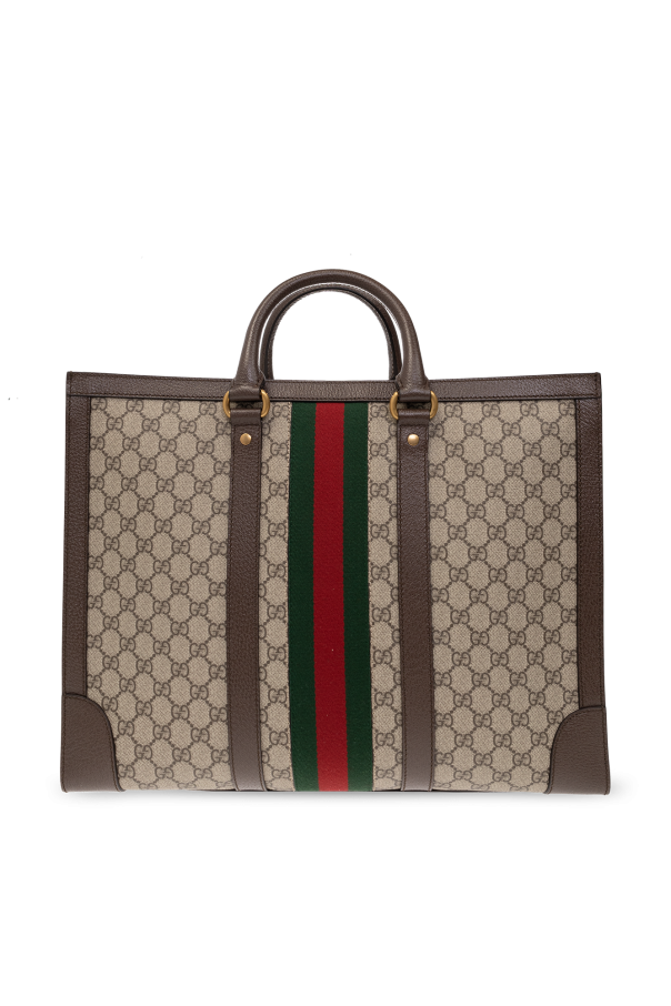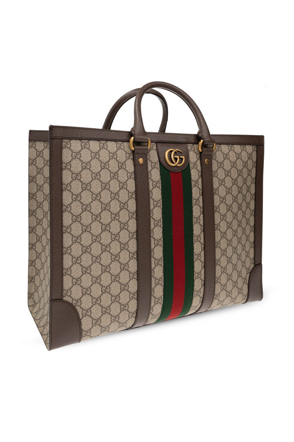 Brown and beige ‘Ophidia shopper bag from Gucci. Made of coated canvas with leather trims, this item features a carabiner clip closure and is decorated with a monogram pattern, metal logo detail and Web stripe in green and red. It is complete with two half-round handles, detachable and adjustable shoulder strap, antique gold-tone metal hardware and one internal compartment with one zip pocket and one slip pocket.