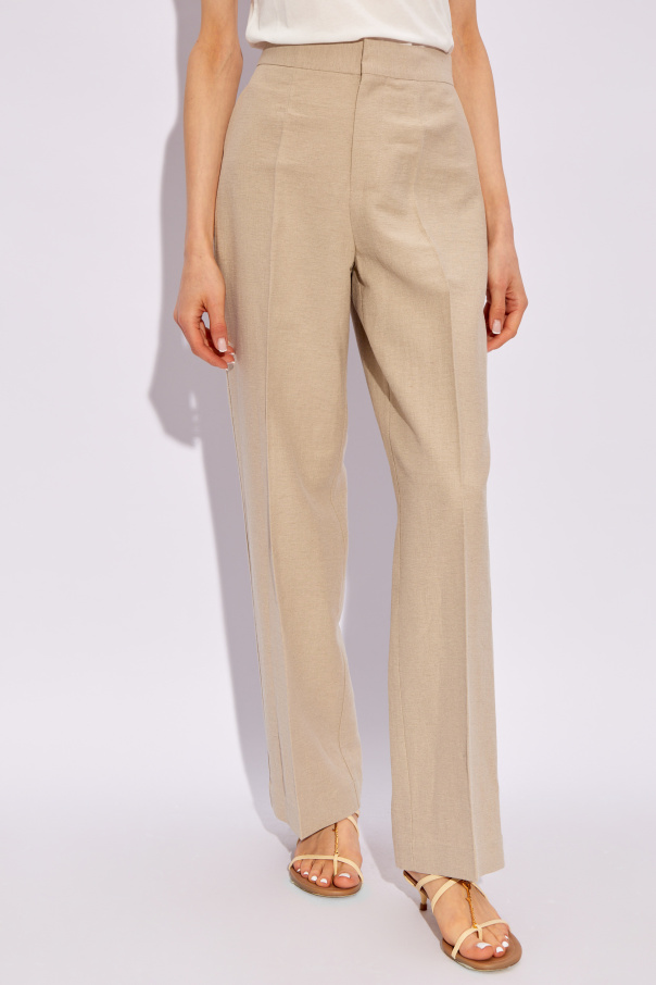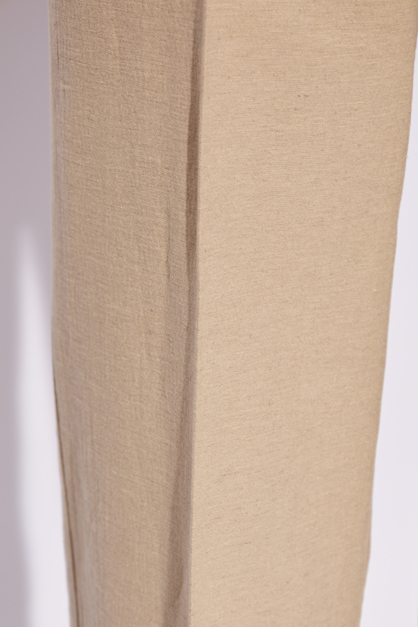 Introducing the 'Dene' trousers by Aeron – a testament to minimalist elegance and superior craftsmanship. These trousers, presented in a sophisticated beige hue, are meticulously tailored from a premium blend of linen, cotton, and a touch of polyamide. This exquisite fabric selection not only offers a visually textured appearance but also ensures durability and comfort. The 'Dene' trousers boast a classic cut with a distinct crease running along the legs, culminating in a wide or palazzo-style silhouette that gracefully flares towards the bottom. The design features a standard-rise waist, flawlessly fitting the form without any ostentatious branding, adhering to a refined minimalist aesthetic. Its closure is elegantly composed of a zipper, with loops for versatility, and a button, ensuring a secure and sleek fit. Furthermore, the inclusion of three slip pockets adds a practical yet subtle detail to its streamlined design. Every angle of these trousers, as showcased through various model shots, highlights their impeccable fit and the fluidity of their cut, making them an essential piece for the discerning wardrobe. Why invest in the 'Dene' trousers? Exclusivity: Crafted by the renowned Aeron, these trousers are a symbol of understated luxury. Quality Material: A rich blend of linen and cotton ensures breathability, durability, and an elegant texture. Versatile Design: Their minimalist design and neutral color palette allow for endless styling possibilities. Functional Elegance: Equipped with practical pockets, they blend utility with sophistication.