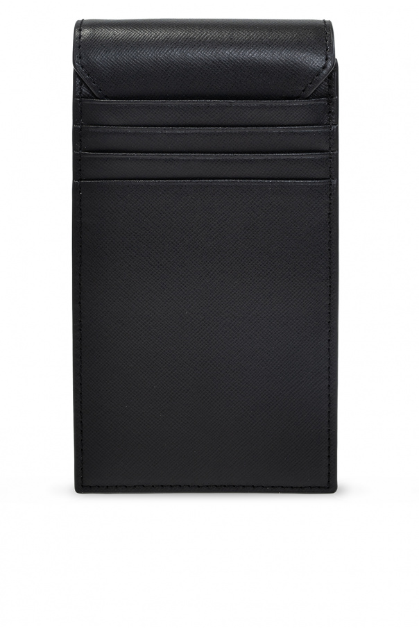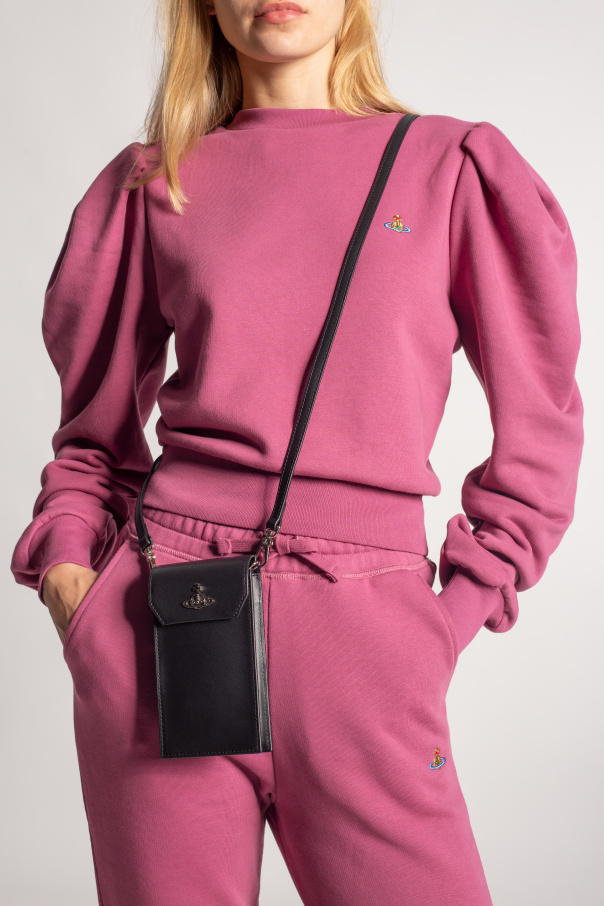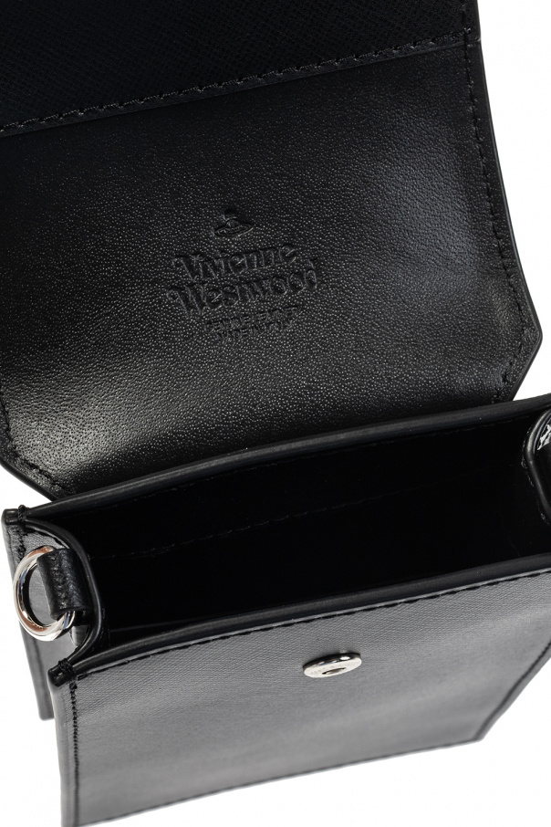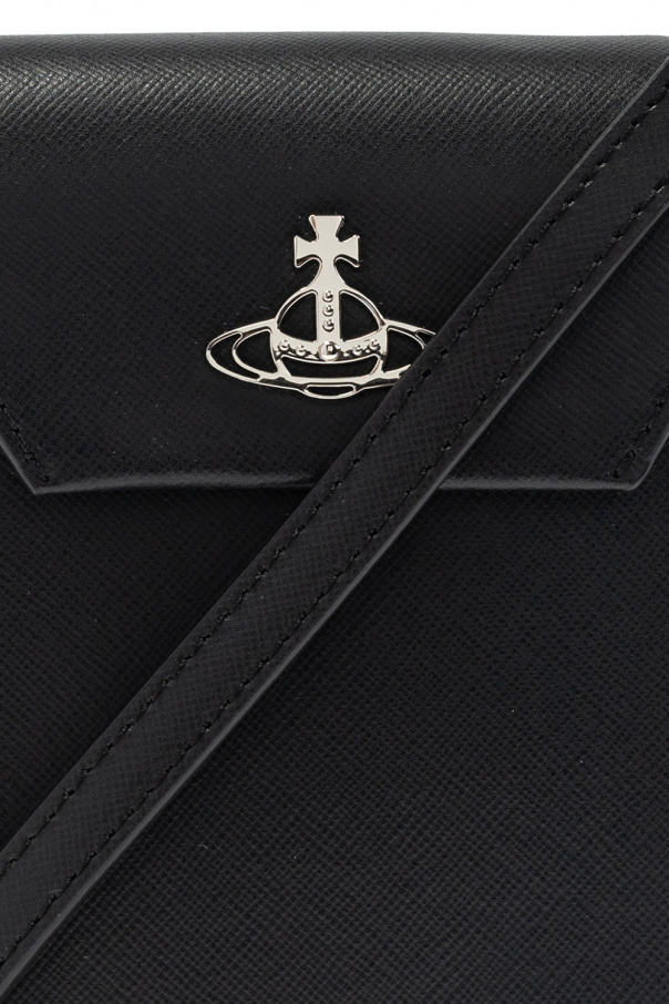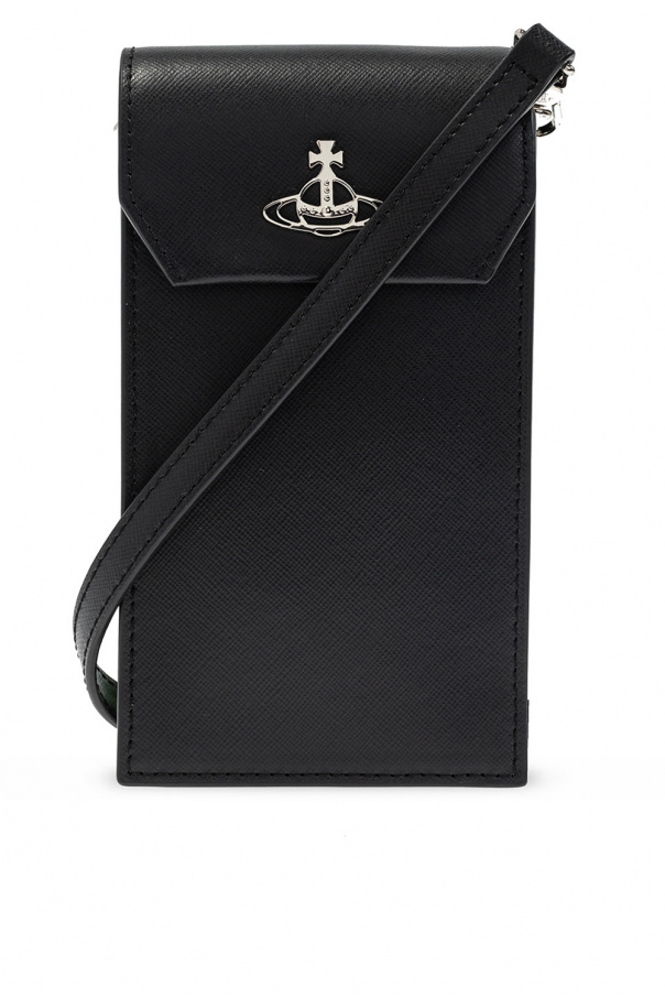 Black phone holder from Vivienne Westwood. Made of leather, this item features a snap closure, metal logo detail, four card slots, detachable and adjustable strap, one internal compartment and silver-tone metal hardware.