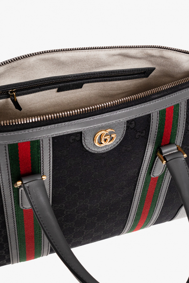 Black and grey ‘Bauletto Large’ duffel bag from Gucci. Crafted from monogrammed ‘Original GG’ canvas and trimmed with calf leather, this design secures with a zipper with a padlock and showcases ‘Double G’ hardware, green and red Web stripe detailing, two half-round handles with detachable pendants: a keyed one and one with a logo and a snap closure; a detachable and adjustable shoulder strap, gold-tone metal elements and one internal compartment with two zip pockets.