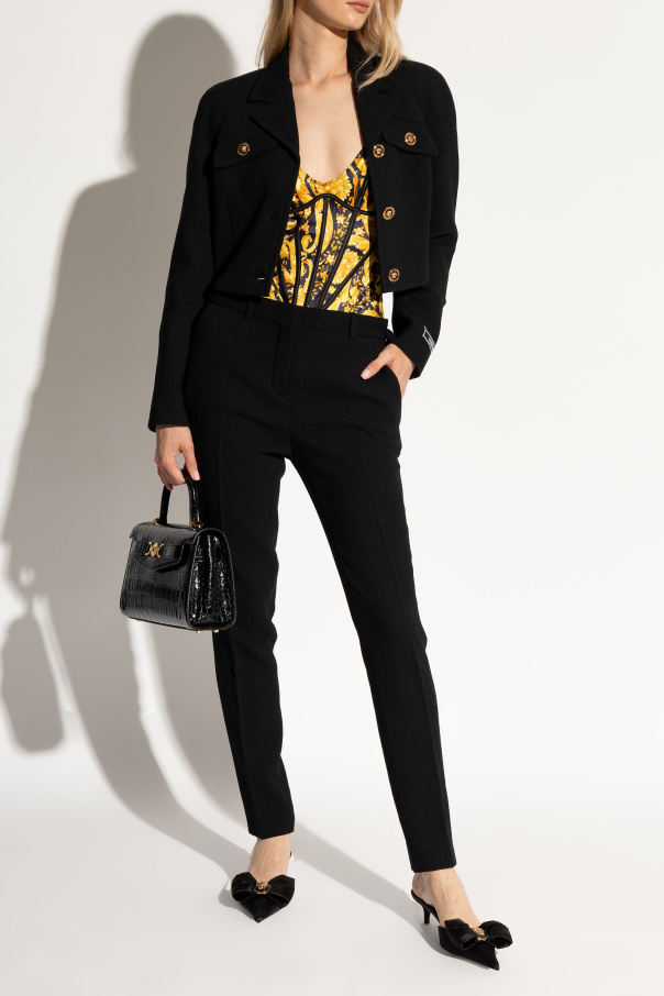 Introducing a masterpiece of footwear elegance, the Versace Satin High Heels, designed for the discerning woman who seeks to elevate her evening and formal attire. Crafted with meticulous attention to detail, these shoes are a testament to the sophistication and prestige that define the Versace brand. The exterior, fashioned from 100% premium satin, bestows upon these heels a lustrous sheen that catches the eye, complemented by the timeless allure of their black hue. This makes them not only a versatile addition to any wardrobe but also a standout piece capable of completing any ensemble with grace. The pointed front design epitomizes the quintessence of feminine footwear, while the slender, low heel ensures a comfortable experience without compromising on the elegant silhouette. A distinctive feature is the large, satin bow adorning the front, centered with a gold medallion bearing the iconic Versace logo - a subtle yet powerful statement of luxury and heritage. Moreover, the inclusion of a satin strap at the rear secures the shoe gracefully upon the foot, enhancing both form and function. The interior, lined with a blend of leather and fabric, alongside the exclusively leather sole, promises an experience of comfort matched with durability. The contrasting white interior and strap, detailed with the black Versace branding, highlight an exquisite attention to detail and a commitment to exclusivity. Why Invest in These Versace Satin High Heels? Exceptional elegance and style with a timeless black satin finish. Iconic Versace logo medallion and bow add a unique touch of luxury. Designed for comfort with a supportive strap and low, sleek heel. Versatile design that complements both formal and evening wear. High-quality materials including a leather sole and interior for lasting wear.