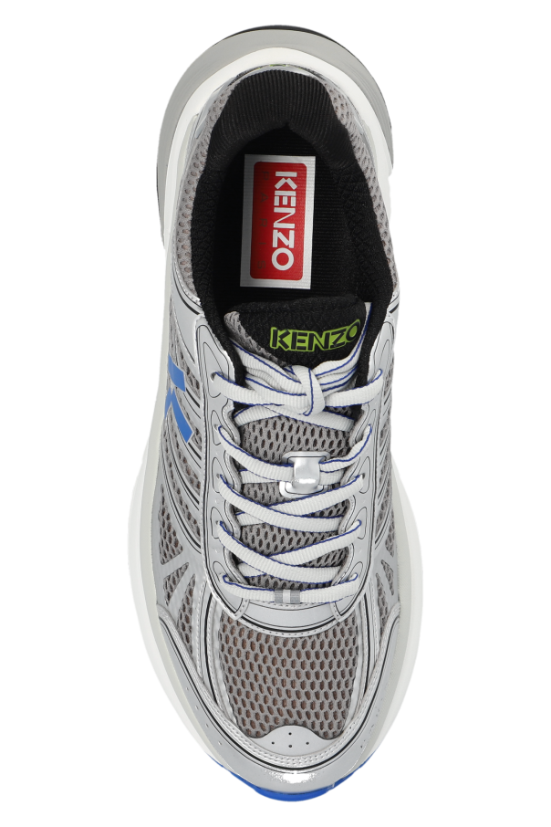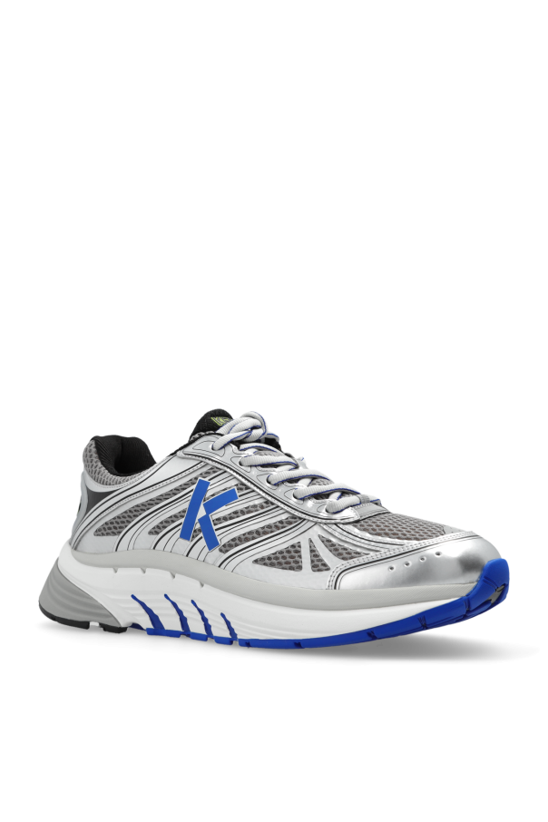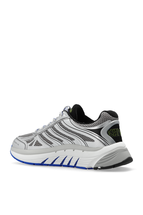 Grey, white and silver-tone lace-up sneakers from Kenzo. This pair sits on a blue, black and white rubber sole and showcases the brand's logo and a perforated front.