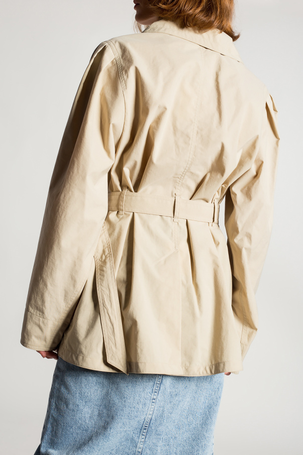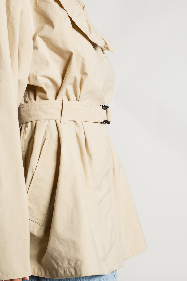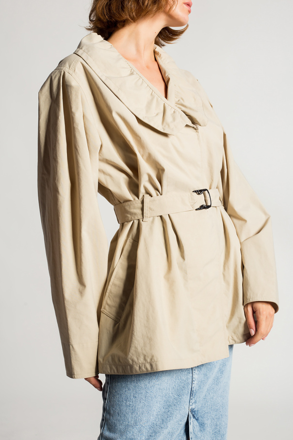 Beige coat from Isabel Marant. Fastened with snaps and tied at the waist, this garment is complete with a ruffled collar, two slip pockets and long puff sleeves.