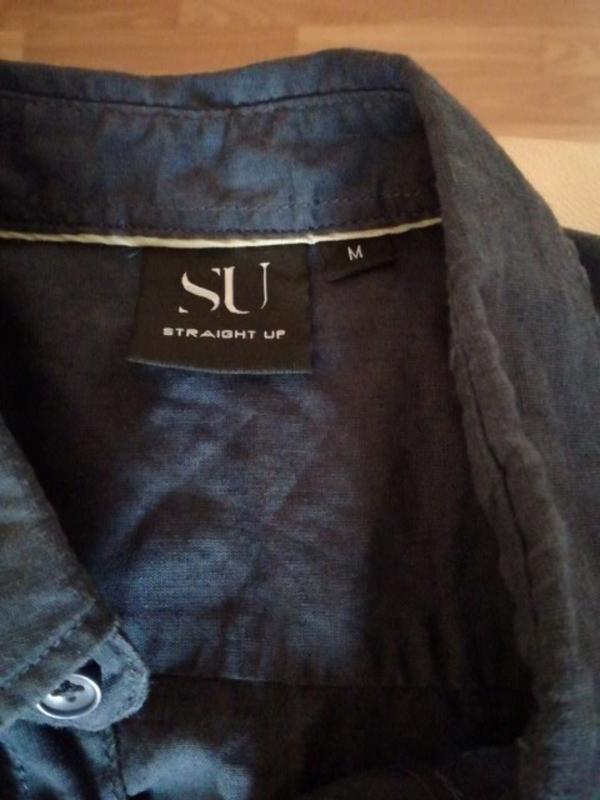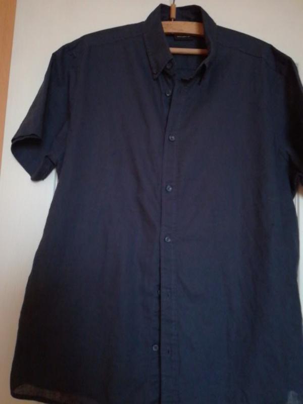 Цвет насыщенный,красивый темно синий.Идеально под джинсы.Состав 55%лен,45%катон. Воротник пристегивается.Размер М.Замеры:ПОГ 59см.Ширина плеч 47см .Длина 77см.Длина рукава 23см.Сделана в Бангладеш.Стан дуже хороший.