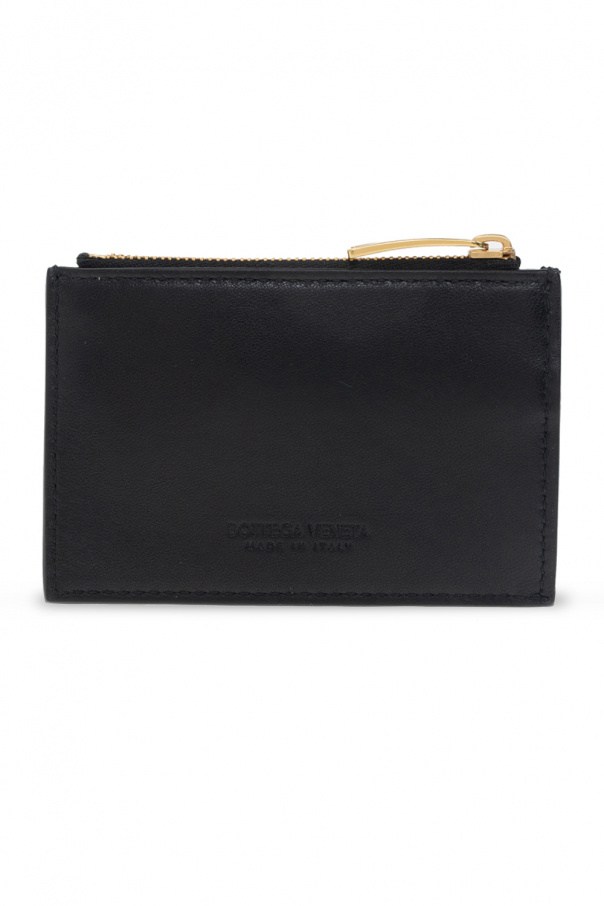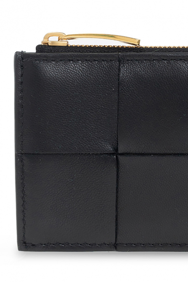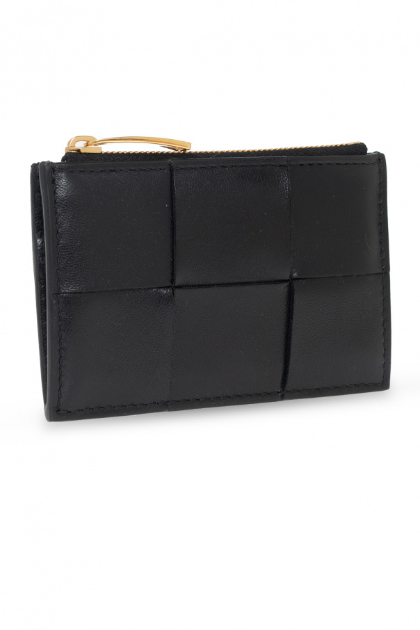 Black key holder from Bottega Veneta. Crafted from lamb leather and calf leather, this item showcases the brand's signature ‘Intreccio’ weave, gold-tone metal hardware and a key ring.