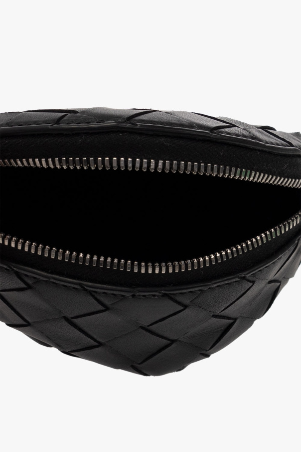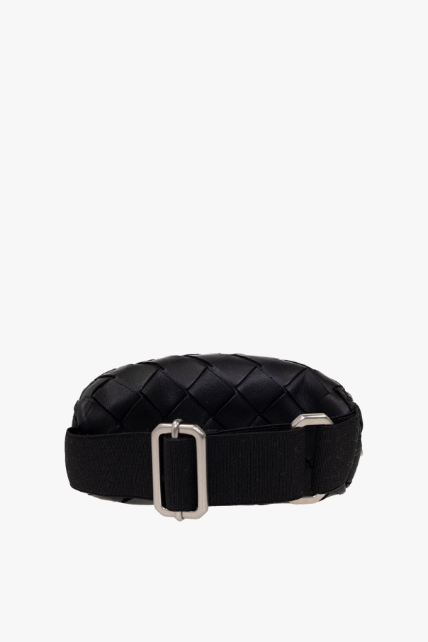 Black pouch from Bottega Veneta. Made of leather with the brand’s signature Intreccio weave, this item features a zip fastening, adjustable elastic strap, one internal compartment and silver-tone metal hardware.