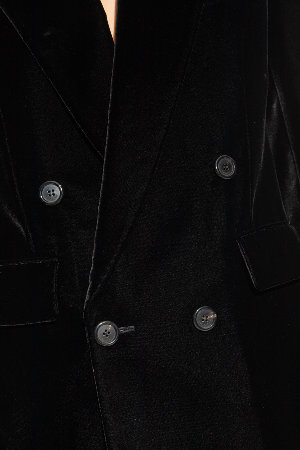 Black blazer from Saint Laurent. Made from velvet fabric with a double-breasted silhouette, this style features a single back vent, button fastenings, peak lapels, one slip pocket, two flapped pockets, padded shoulders and long sleeves with button cuffs.