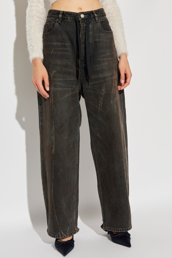 Introducing the quintessence of vintage allure, Balenciaga presents a pair of jeans that effortlessly marry classic aesthetics with modern sophistication. Crafted from 100% premium cotton, these jeans boast a timeless design enriched by a distinctive vintage effect. The dominant dark hue, artfully faded and distressed, evokes an essence of cherished wear and enduring style. The jeans feature a high-waist cut and straight-leg silhouette, offering a flattering fit that transcends seasonal trends. Contrast stitching accentuates the nostalgic vibe, while the button closure and traditional front pockets ensure functionality amidst fashion. The rear waistband proudly displays the white Balenciaga logo against a stark black background, a subtle yet significant nod to the brand's renowned craftsmanship and design prowess. Why Purchase This Product? Exceptional quality material: 100% cotton for lasting comfort and durability. Iconic vintage appeal: Distressed and faded details for an authentic worn look. Elevated design details: Contrast stitching and designer logo for distinctive style. Versatile fashion: Perfect for a myriad of occasions, from casual outings to sophisticated gatherings.