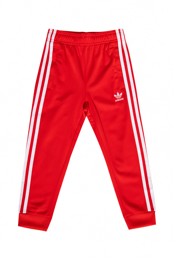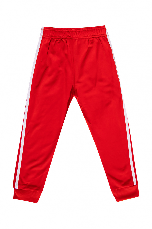 Red sweatshirt and sweatpants set from ADIDAS Kids, the ‘Primeblue’ line. The sweatshirt fastens with a zip and is enriched by a multicolored logo print and ribbed trims. The sweatpants have a drawstring waist and are complete with a logo print, two front zip pockets and ribbed cuffs. Primeblue is a performance fabric made with Parley Ocean Plastic, upcycled plastic waste intercepted on remote islands, beaches, coastal communities and shorelines, preventing it from polluting our oceans. Products made of Primeblue contain a minimum of 40% recycled material in total.