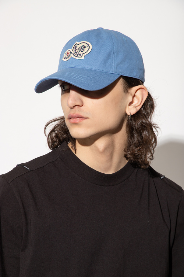 Blue baseball cap from Moncler. Made of cotton, this item features a cream, navy blue and red logo patch and a strap adjuster with a silver-tone buckle at the back.
