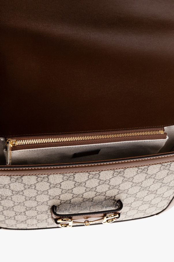 Beige and brown ‘Horsebit 1955’ shoulder bag from Gucci. Made of the brand’s signature GG Supreme with calf leather trims, this model features a slide closure, metal horsebit detail, detachable and adjustable shoulder strap with a Web stripe in green and red, gold-tone metal hardware and one internal compartment with one slip pocket and one zip pocket.