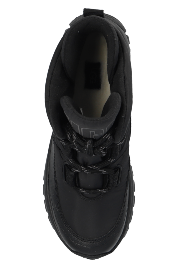 Black ‘Yose Puffer Lace’ snow boots from UGG. Made of waterproof fabric with a membrane, this design features nonwicking laces, UGGplush™ lining, logo detail, Treadlite midsole and black White Spider rubber outsole.