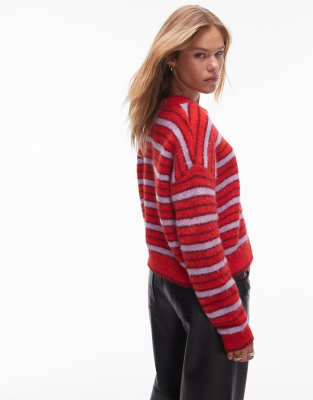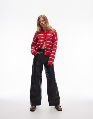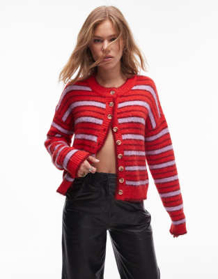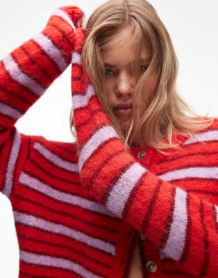 Topshop knitted oversized boxy stripe cardigan in red and lilac