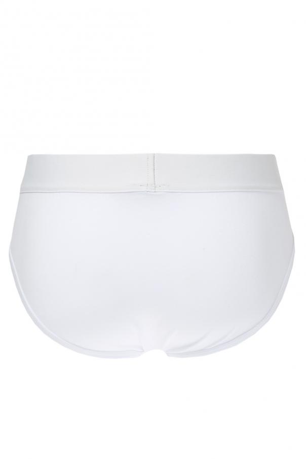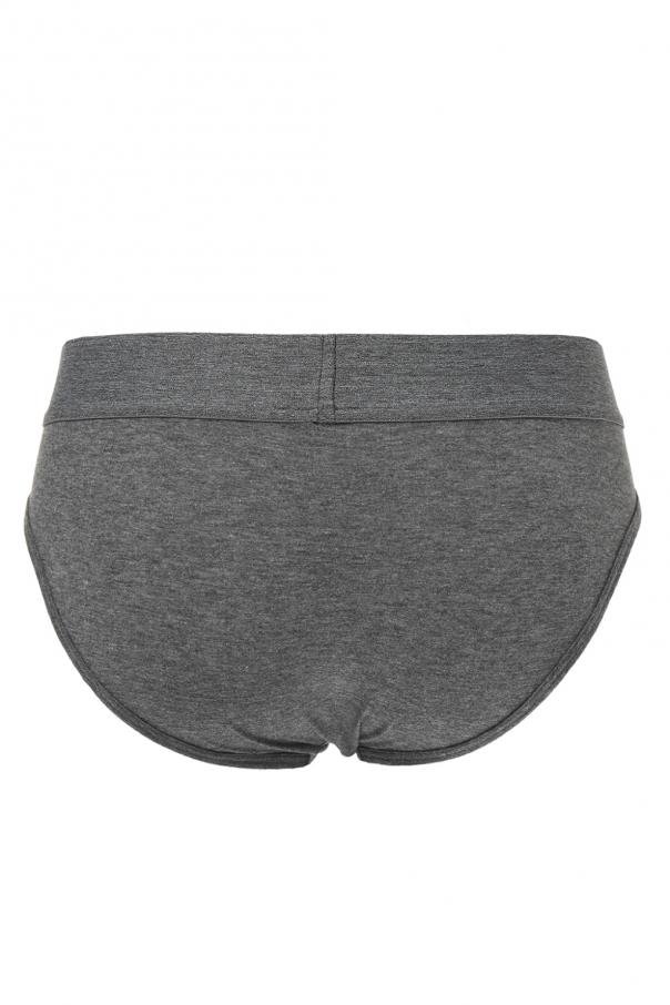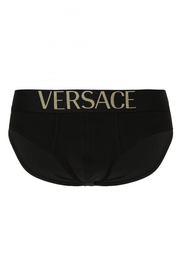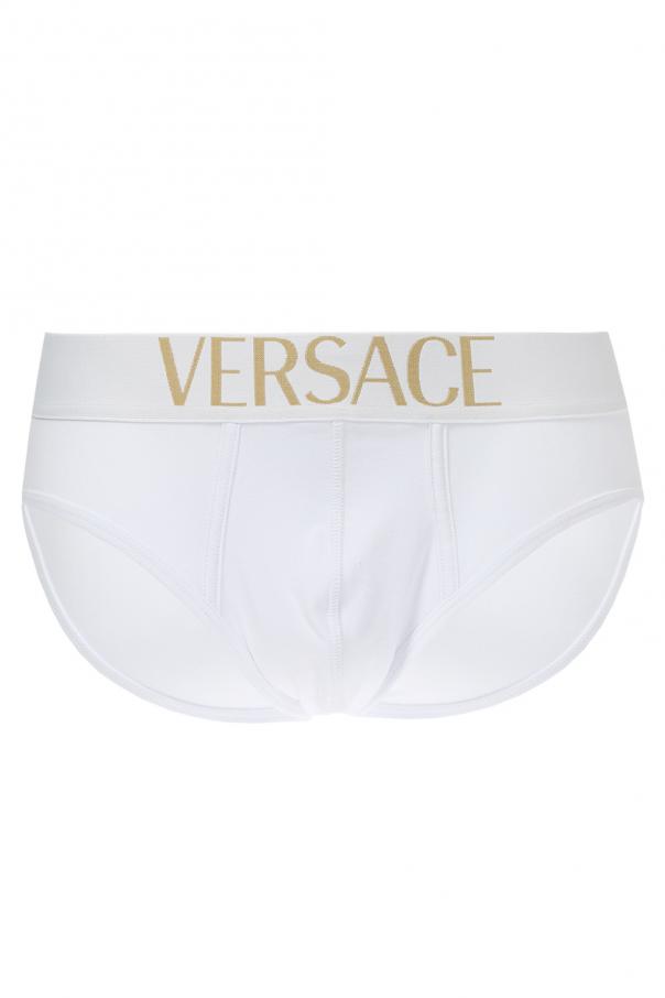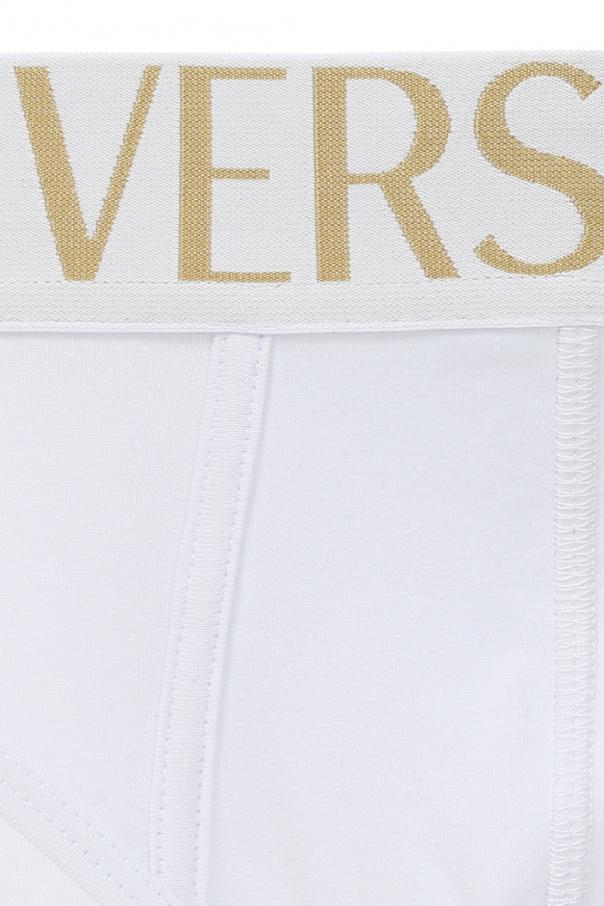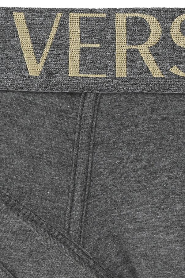 Cotton briefs three-pack from Versace consisting of white, grey and black pairs. Elastic waistband with embroidered gold-tone logo.