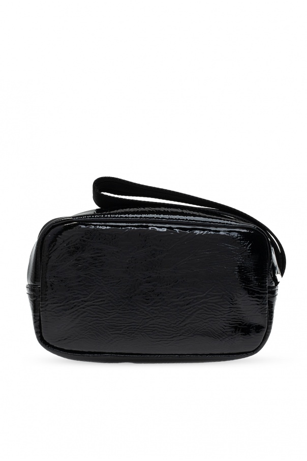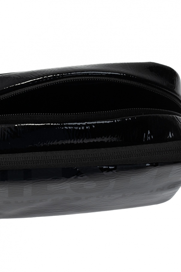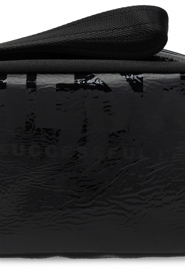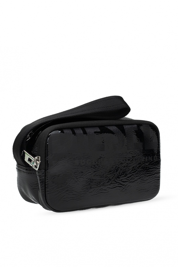 Black hand bag from Diesel. Fastened with a zip, this design features a logo print, front zip pocket, wrist strap and one internal compartment.