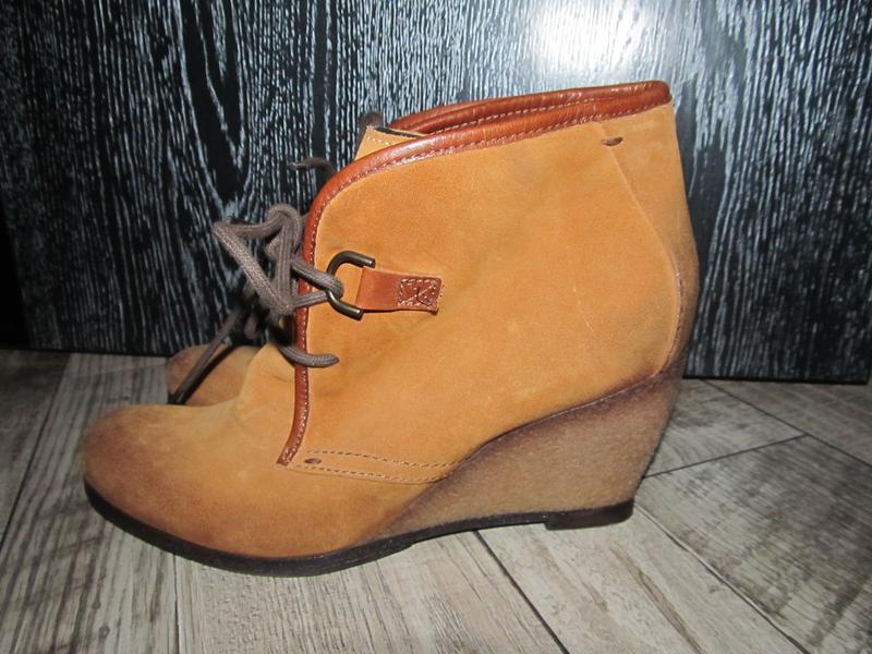 Охмох шкіряні черевики р. 41 - 26,5 см Матеріал - натуральна шкіра,на шкарпетках і п'яті з напиленням від затирання. Всередині шкіряна устілка. Утеплювача немає. Підійдуть на ніжку 26-26.5 см. Висота танкетки 8 див. На ніжці акуратні і зручні. Стан ідеальний. З нюансів дивіться на фото 4-5 по внутрішній поверхні лівого черевика дві цятки. Ціна 550грн. OXMOX" - це відома німецька компанія-виробник взуття, в основі концепції бренду якої лежить поєднання комфорту і стилю. Для виробництва застосовуються тільки самі передові технології і новітнє сучасне обладнання, що дозволяє виготовляти високоякісні вироби. Саме тому цей бренд розрахований на тих, хто вміє цінувати дійсно хороші речі і уважно ставиться до підбору власного гардеробу