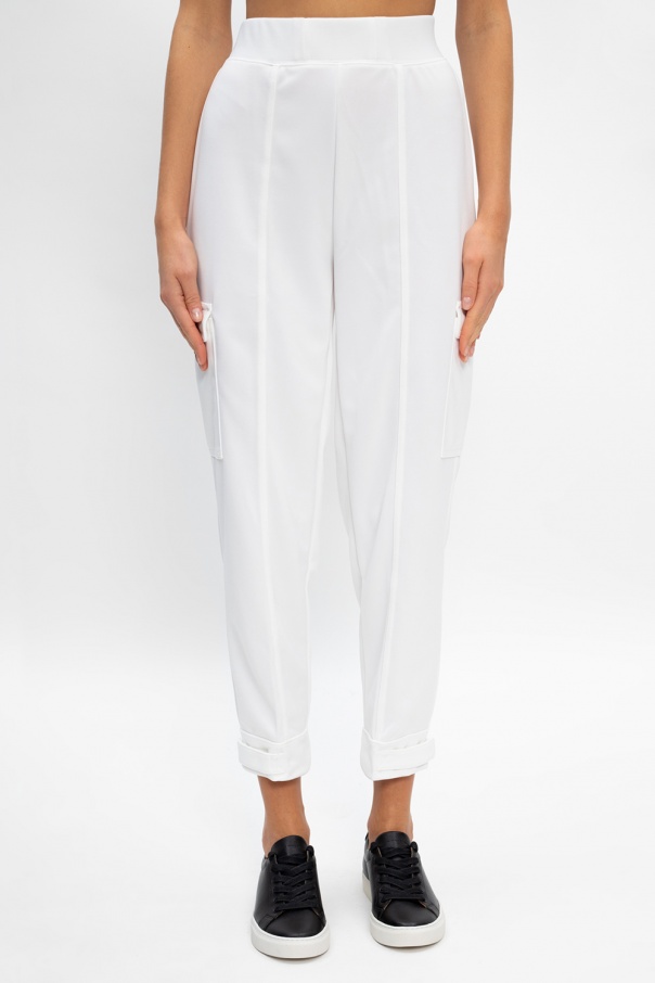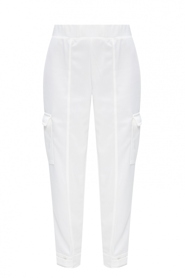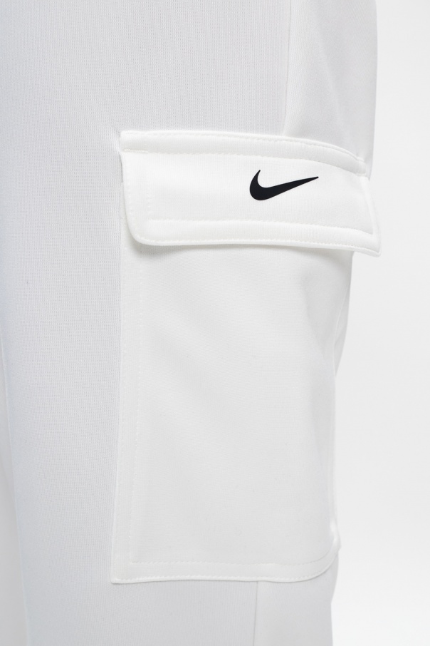White sweatpants from Nike. This model features an elastic waistband, vertical seams, black logo print, two flap pockets and velcro straps at the cuffs.