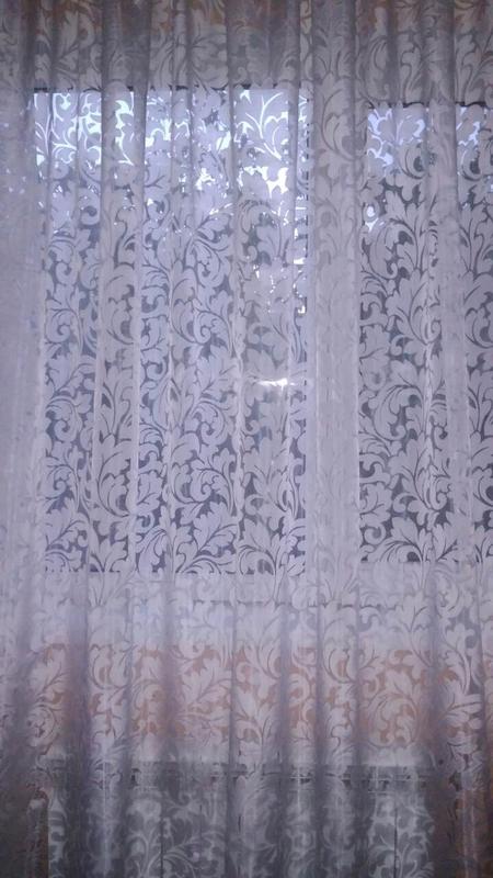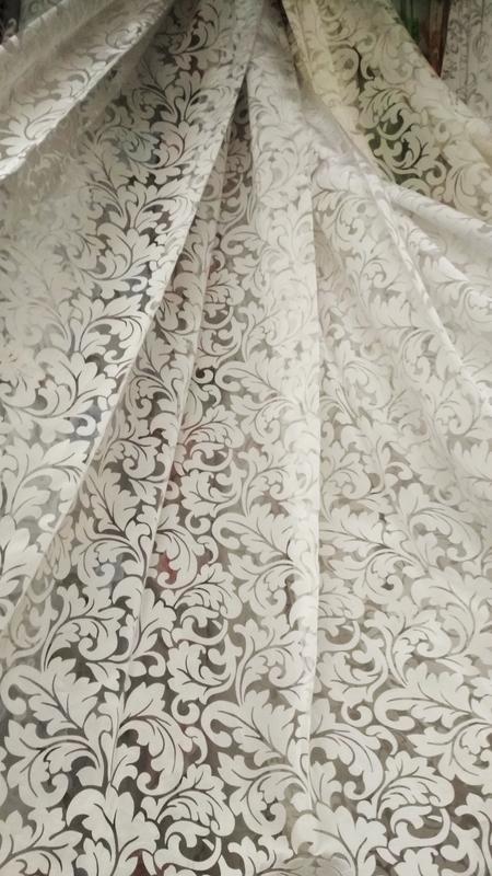 Дуже гарної якості, основа поліестер, напівпрозора тканина схожа на органзу. Виробництво Туреччина. Малюнок тканний, зроблений з ниток вплетенных в основу.