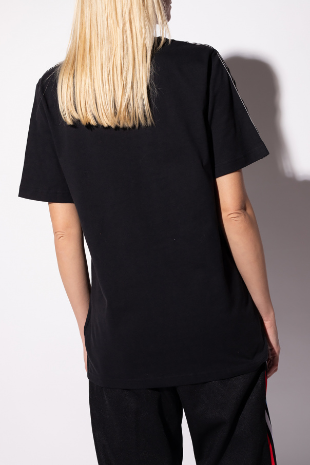 Black crewneck T-shirt from ADIDAS Originals. Made of cotton, this style showcases an embroidered white logo on the front and the brand's signature three stripes in white on the sleeves.