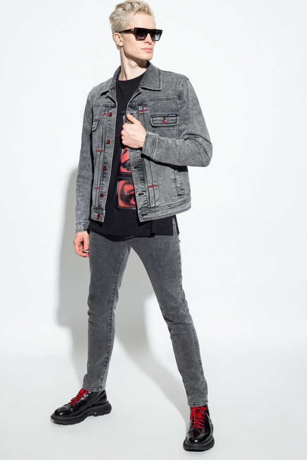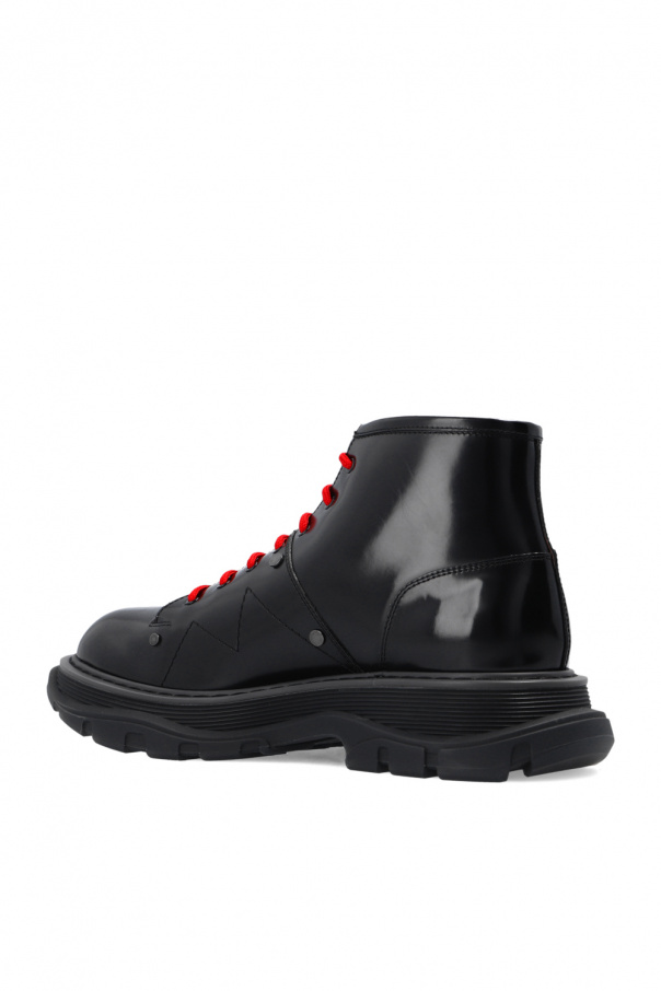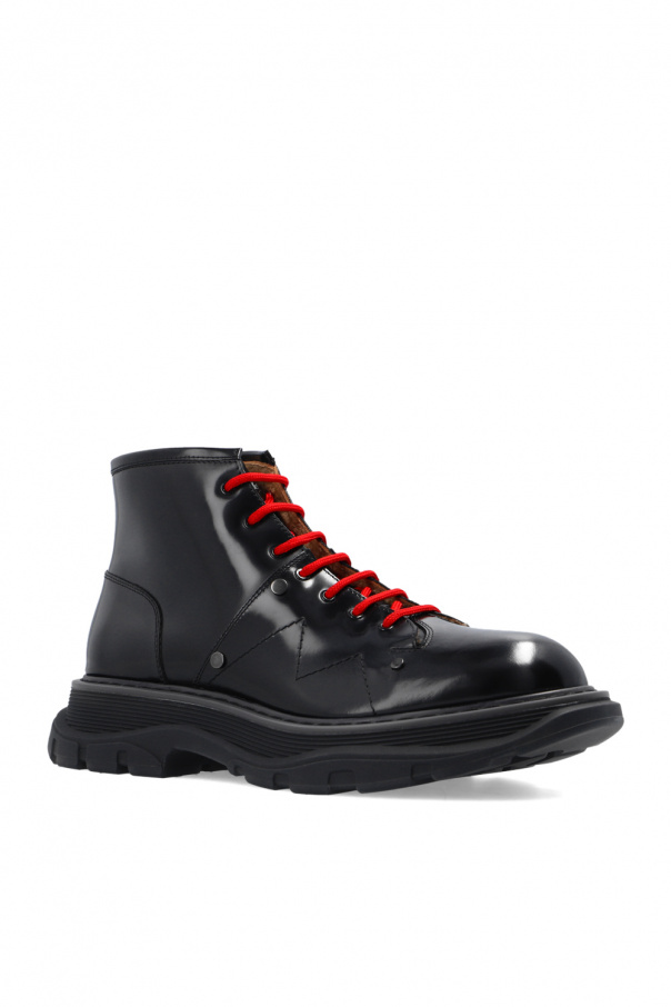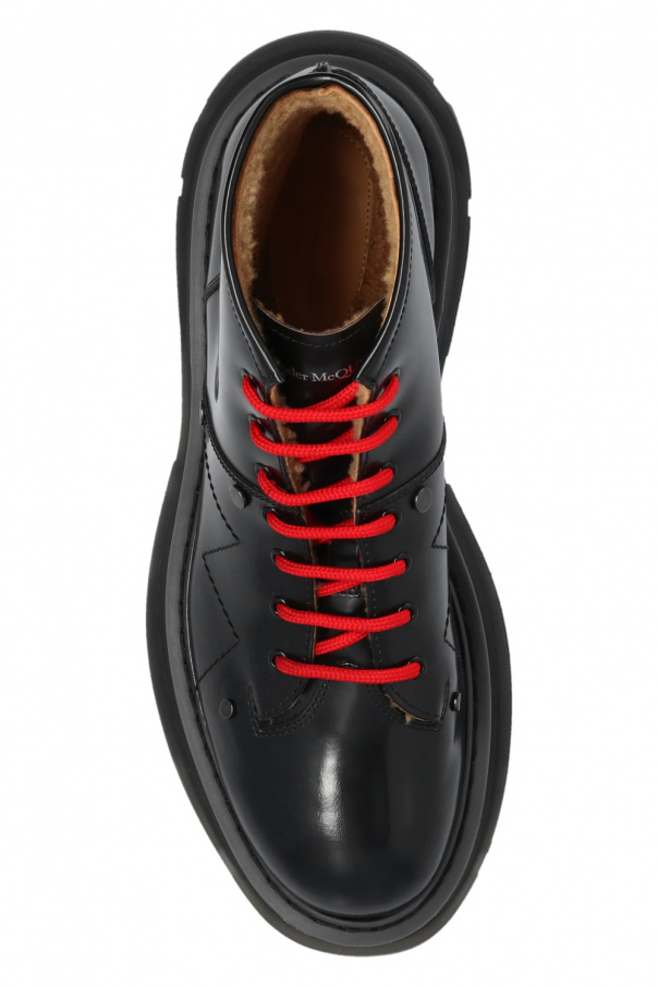 Black ankle boots from Alexander McQueen. Made of leather, this lace-up model features an almond-shaped toe, shearling trims and a black rubber sole.