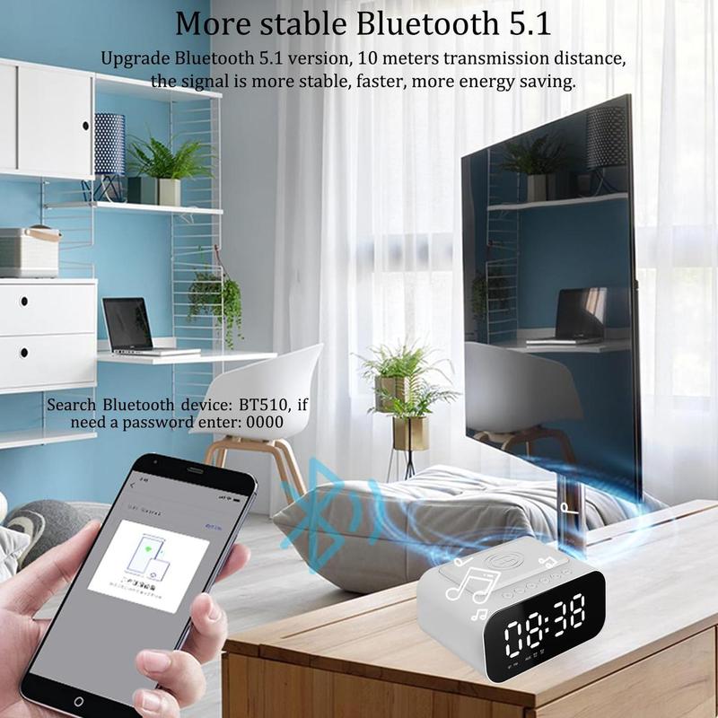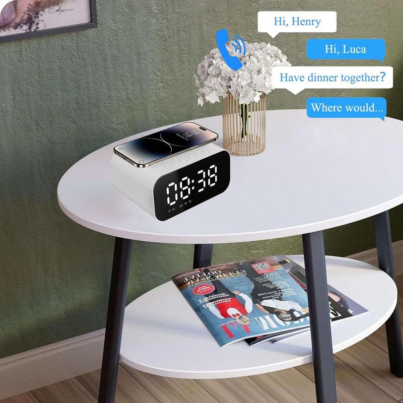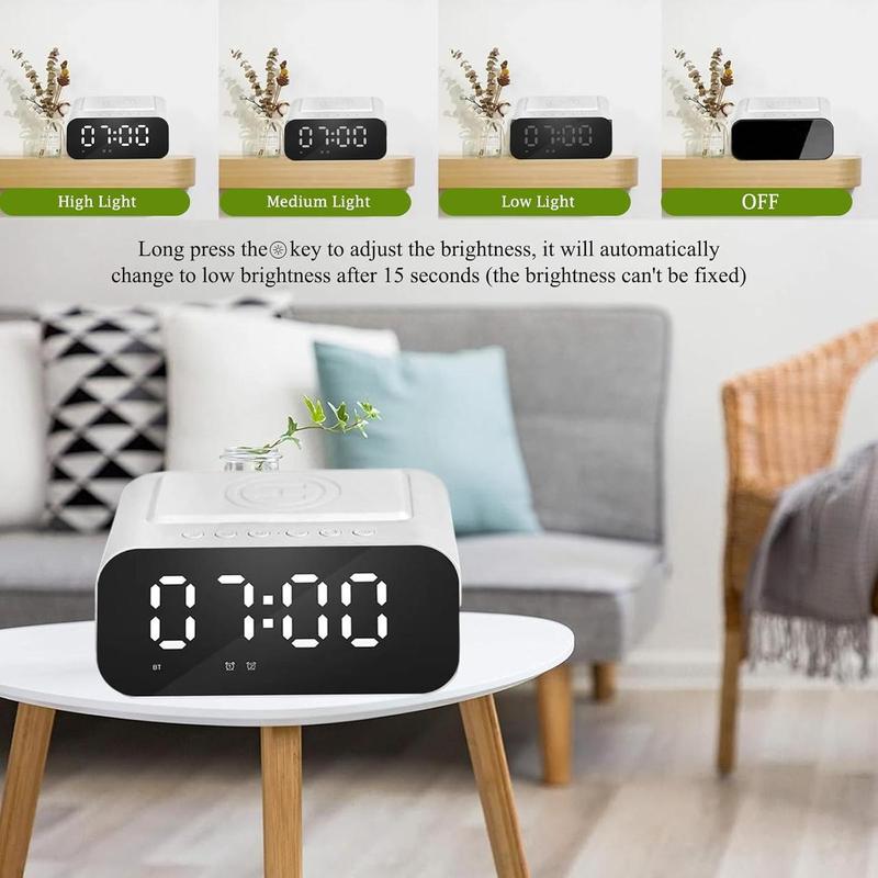 - ⏰【Многофункциональный радиобудильник 4 в 1】 Сочетает в себе будильник, беспроводную зарядную станцию, динамик Bluetooth и FM-радио. Он компактен и не занимает много места на прикроватной тумбочке.