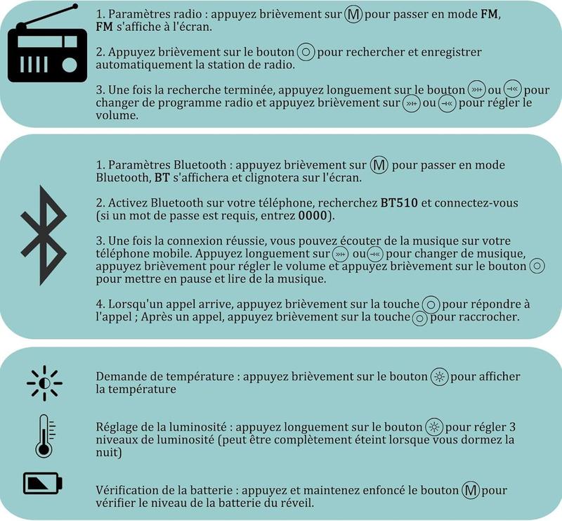 - ⏰【FM-радио и Bluetooth】 Диапазон FM-радио: 76-108 МГц. Подключите аудиокабель к аудиопорту 3,5 для лучшего приема антенны, можно регулировать 16 уровней громкости. Динамик Bluetooth мощностью 5 Вт оснащен высококачественным динамиком Boost. Вы можете слушать музыку или аудиокниги с помощью простого подключения Bluetooth. Если вам неудобно держать телефон во время ответа на звонок, вы также можете ответить на звонок в режиме громкой связи с помощью кнопки будильника.