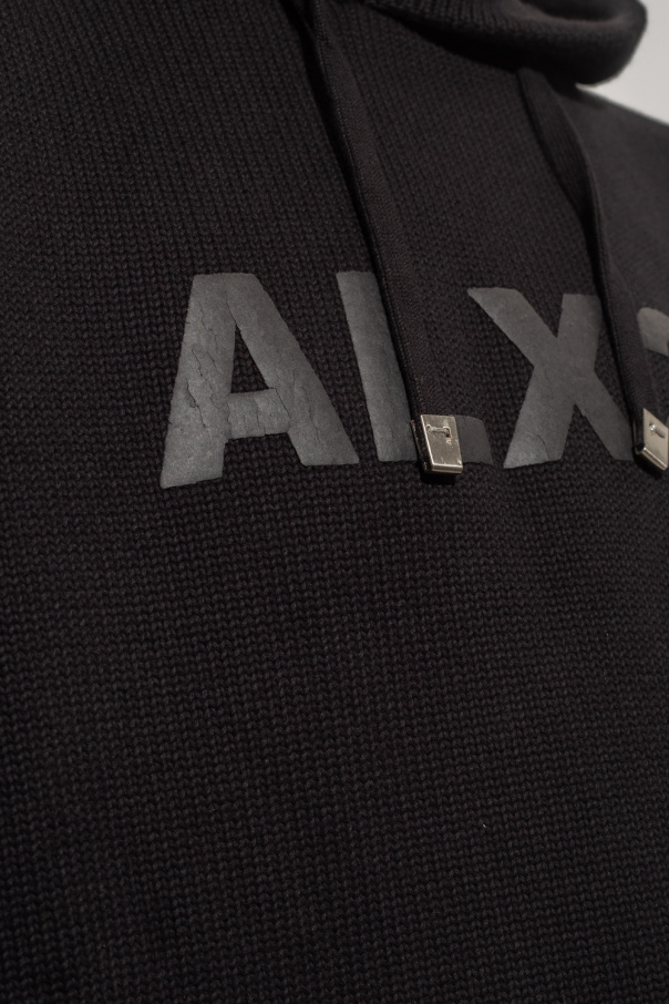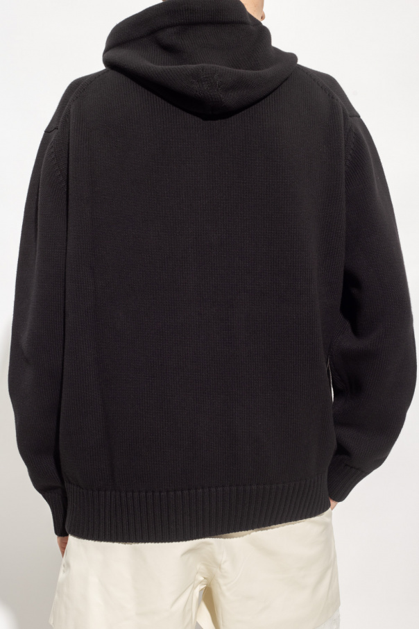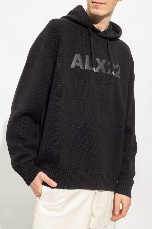 Black hooded sweater from 1017 ALYX 9SM. Crafted from cotton, this long sleeve design features a logo print with a cracked effect, drawstring hood with the label’s signature metal Lightercap appliqué in silver-tone and ribbed trims at the hem and cuffs.