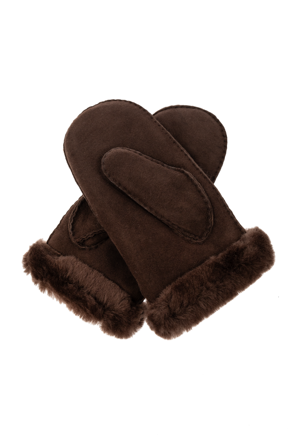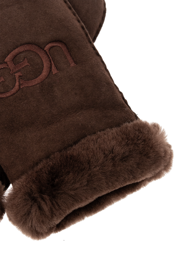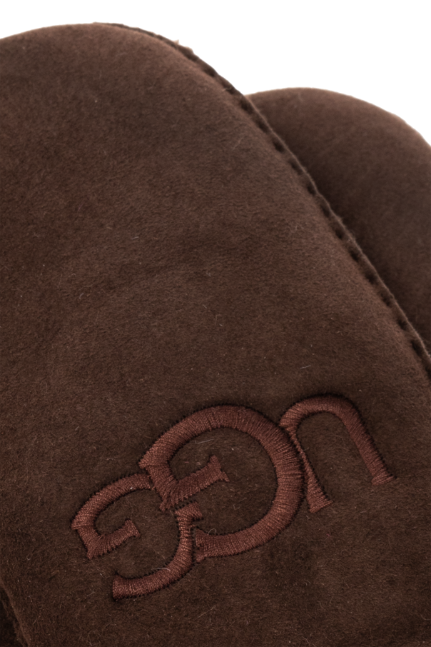 Dark brown gloves from UGG. Made from sheepskin with waterproof properties, this pair showcases an embroidered logo on the front.