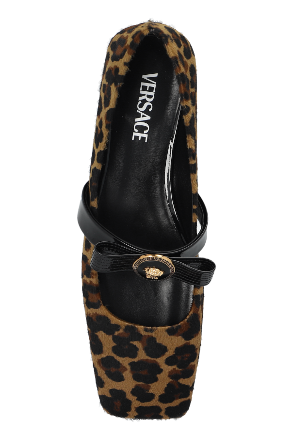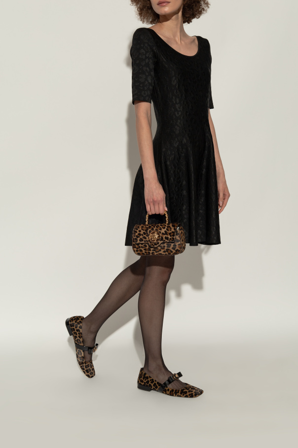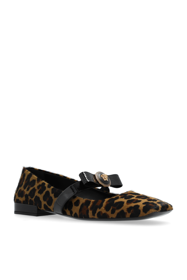 Exude timeless elegance with the Versace Bow Ballerinas, a sublime fusion of classic design and contemporary flair. These ballerinas feature a sophisticated flat shape with a gently rounded toe, adorned with a striking leopard print pattern that commands attention and style. Crafted from premium materials, these ballerinas boast a luxurious exterior of high-quality textiles that emulate leopard fur, offering an exquisite tactile experience. The intricate detailing includes black decorative straps at the front, culminating in a refined bow embellished with a signature metal medusa charm, epitomizing Versace's iconic aesthetic. The dominant hues of brown and black create a timeless leopard motif, while the interior showcases the brand's logo in white on a black insert, underscoring the exclusivity of this footwear. The flat black leather sole ensures superior comfort, making these ballerinas a versatile addition to both casual and formal ensembles. Modelled alongside black tights and an elegant black dress, these ballerinas seamlessly transition from daywear to evening sophistication, embodying the essence of Versace's visionary design ethos. Why Choose This Product? Elegant flat shape with a refined rounded toe. Striking leopard print pattern for a bold fashion statement. High-quality textile exterior mimicking leopard fur. Decorative black straps with a signature medusa charm bow. Exclusive Versace branding on the inner sole. Comfortable flat black leather sole. Perfect for both casual and formal outfits.