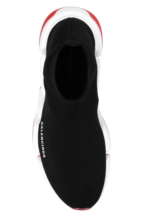 Black ‘Speed 2,0’ sock sneakers from Balenciaga. Resting on a red and white rubber sole, this pair boasts the label’s logo printed in white.