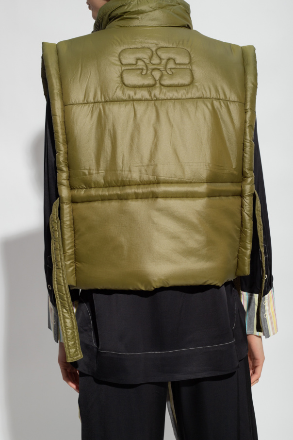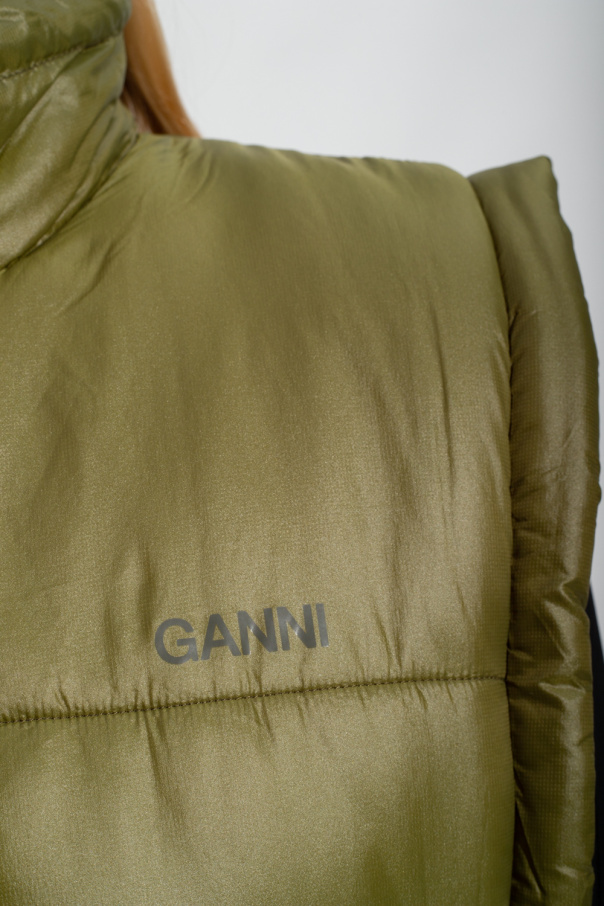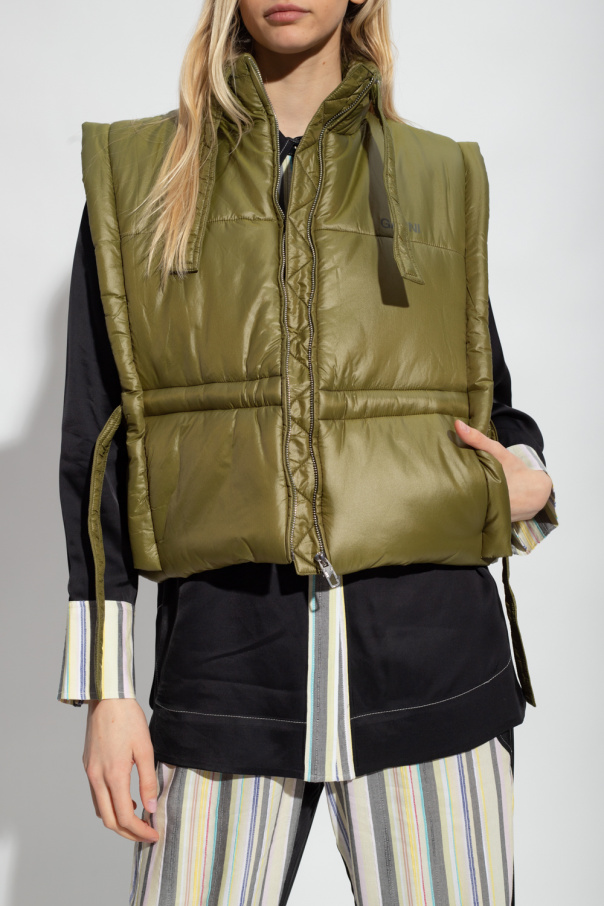 Green vest from Ganni. Crafted from recycled fabric, this design features a zip fastening, drawstring high neck and waist as well as a logo print.