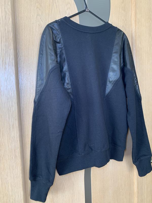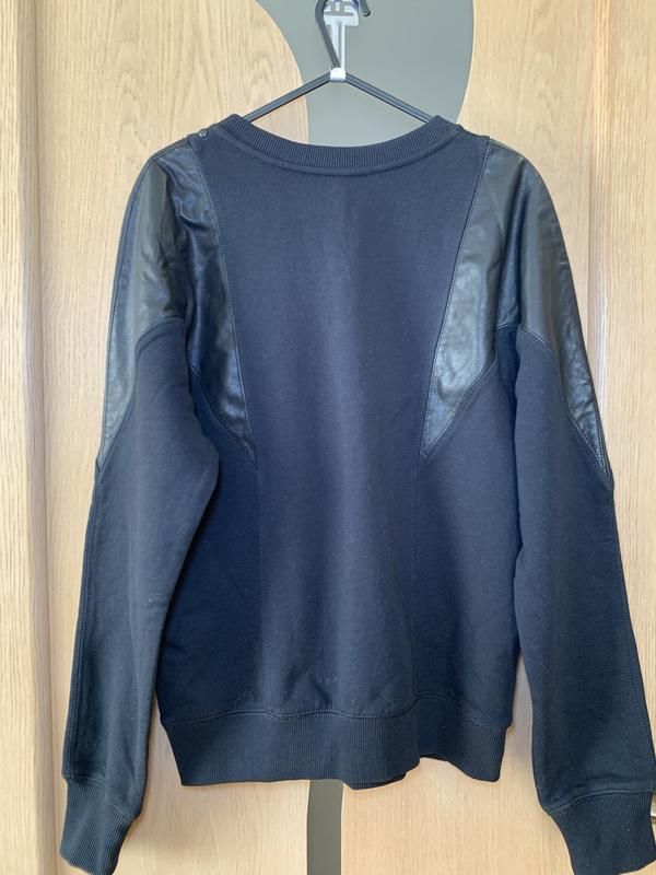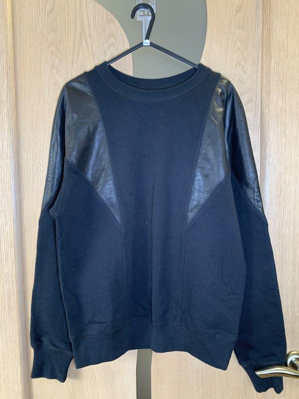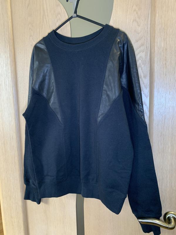 Качественный и стильный свитшот в идеальном состоянии, отлично сделан. Интересный дизайн. ПОГ- 50 см, полуобхват резинки низа 40 см, длина, рукава от горловины-70 см, ширина рукава по бицепсу- 19см.Состояние: ИдеальноеЦвет:- Чёрный