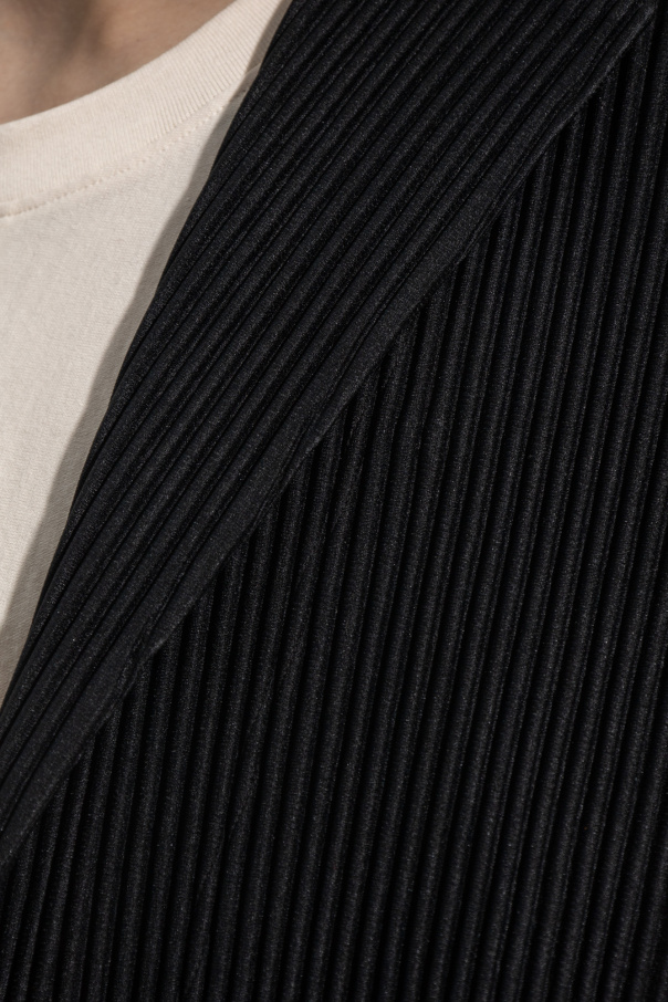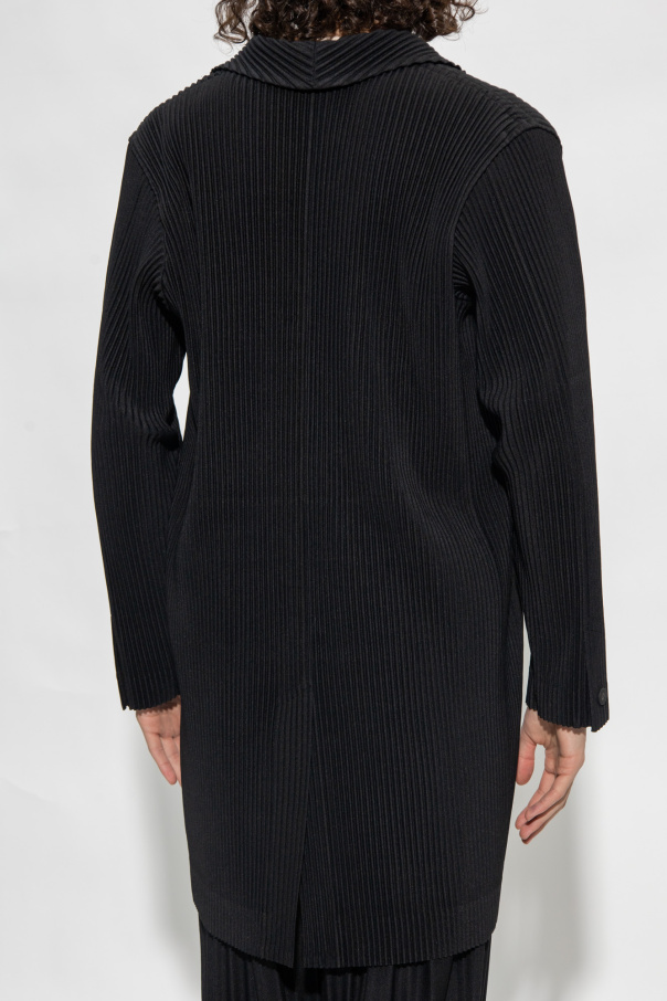 Black coat from Issey Miyake Homme Plisse. Distinguished by the brand's signature pleating technique, this style fastens with buttons and features notch lapels, two slip pockets, long sleeves with button cuffs and a single back vent.